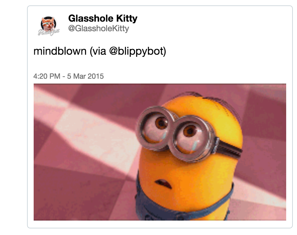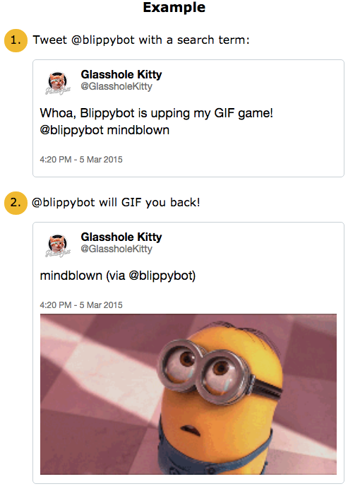 Heya! We made BlippyBot as hack project to make our Tweets more fun. It's really simple to use. Mention the bot (@blippybot) and a query term (excited) in your tweet. BlippyBot posts a relevant GIF. Hilarity ensues! :)