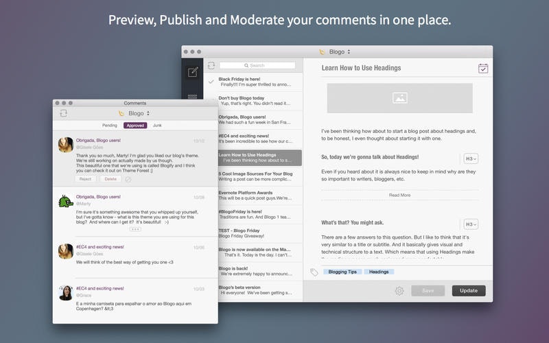 Hi All. Blogo is a blog editor for power bloggers. It’s the easiest and fastest way to write, publish and manage multiple blogs. While we still have a lot to improve, we want to build the best blog editor ever created.