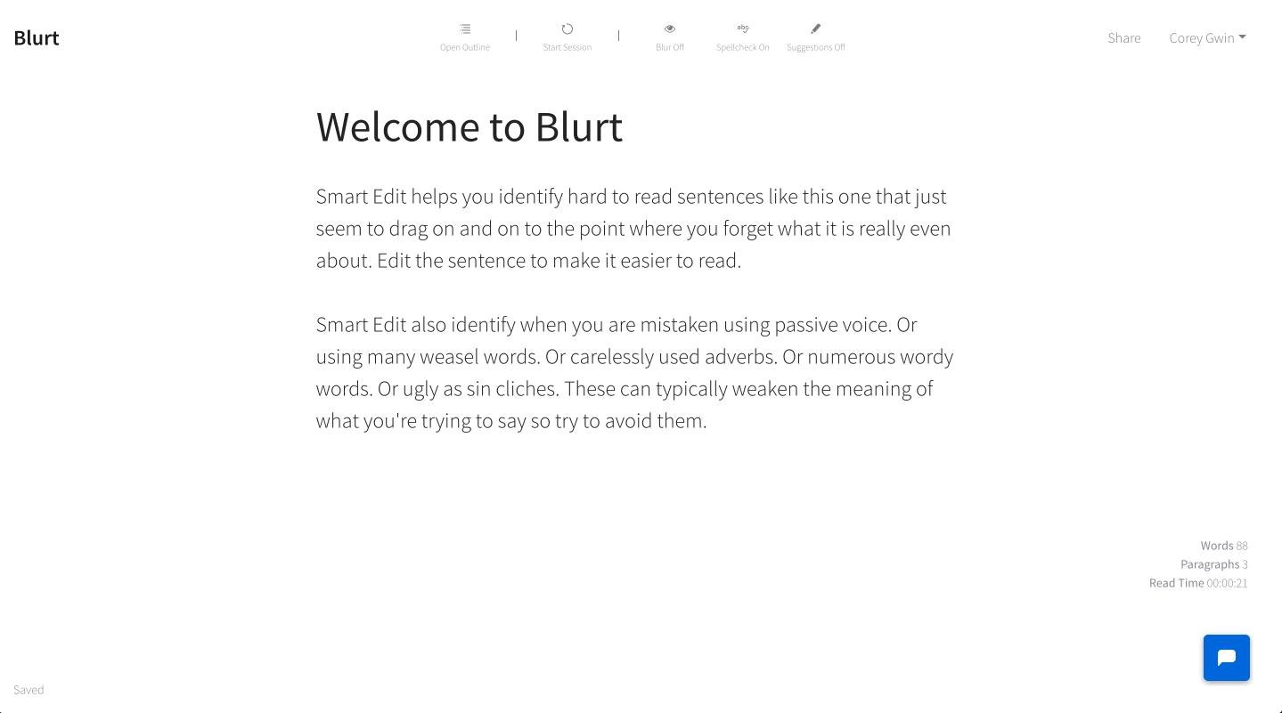When you blurt out what's on your mind, it's easy to get too wordy. Smart Edit aims to identify bad grammar, wordiness, and hard to read sentences so your work is easier to read. You can also highlight a word and Blurt will suggest a synonym. Blurt will eventually provide summarizations and other improvements to help you write your best.