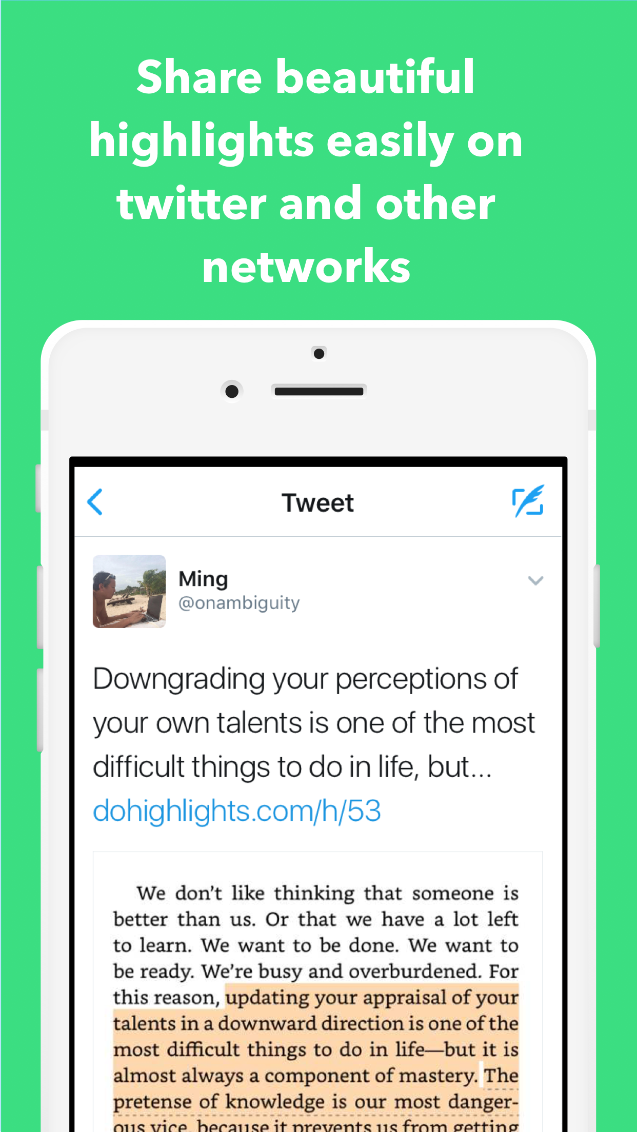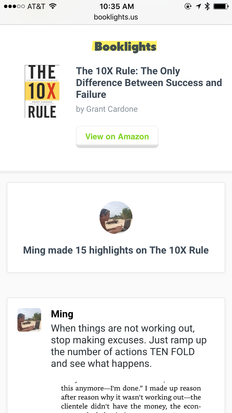 Hey guys! Ming here. We built Booklights because we read a lot of great books, and we always wanted a way to do much more with what we read, instead of being excited for one second, then just forgetting about it like college textbooks. :D By sharing highlights of our learnings it helped us remember and actualize what we read, while helping our friends and followers easily track what we are reading.