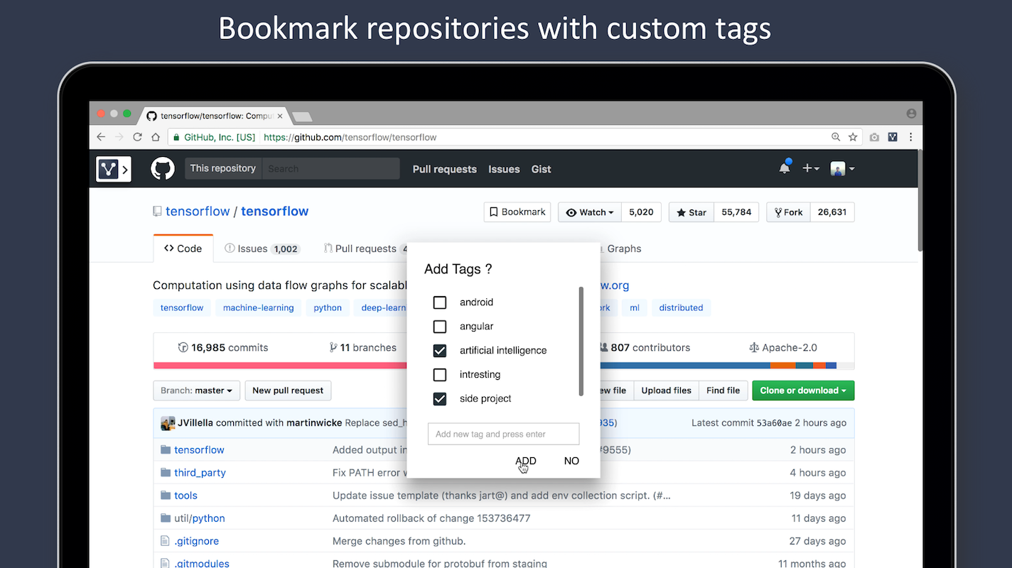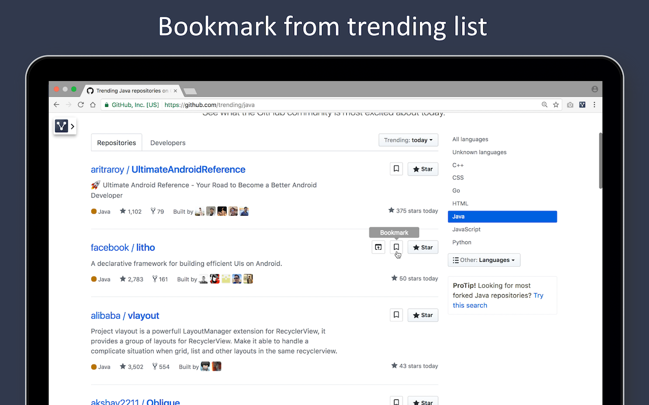 A chrome extension which enables bookmarking feature for github. Bookmark your favorite repositories and organize them with custom tags.