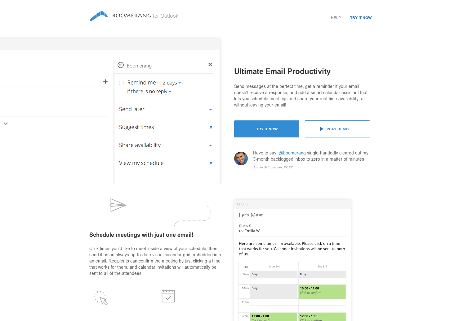 Boomerang is an awesome app which adds tons of cool features to Outlook including the ability to schedule a time to send the email, get follow-up notifications, suggest meeting times and much more.