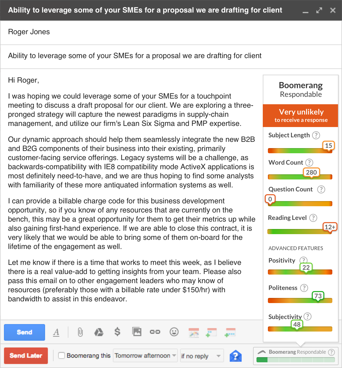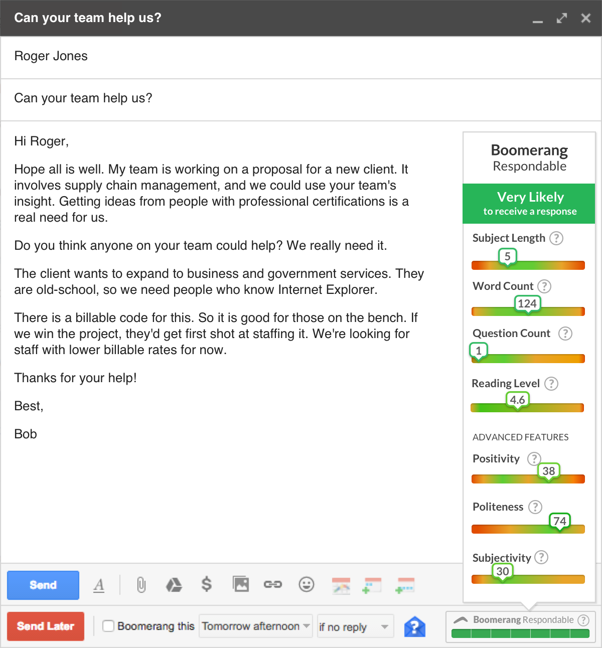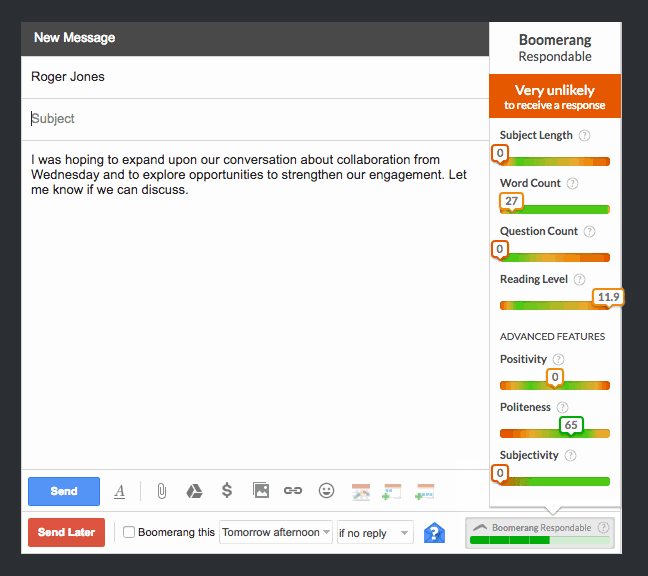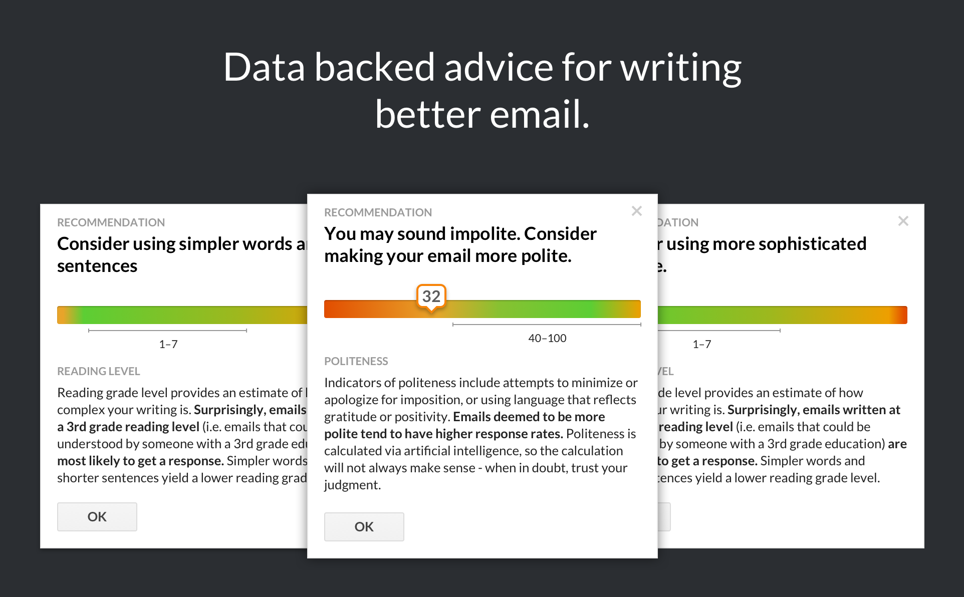 Hi Product Hunters, this is Moah from Boomerang. We're so excited to get this out to you all. A bit of the back story on how and why we made Respondable. Last September, we brought our entire team to Maui for our fall workaway. One of our projects on the workaway was to explore natural language processing and machine learning, as they can be applied to em… See more