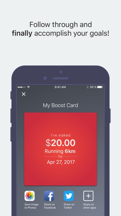 Boost is a mobile app that uses social and financial stakes, as well as data, to help you follow through and accomplish your Health & Fitness goals.