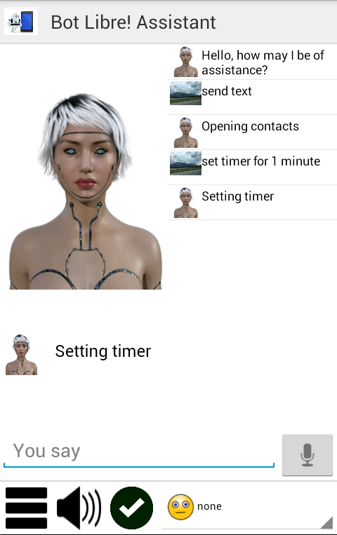Bot Libre Personal Assistant provides your with your own personal assistant for your phone that can open apps, websites, send texts and email, schedule calendar events, set timers, perform math, lookup definitions, and much more.