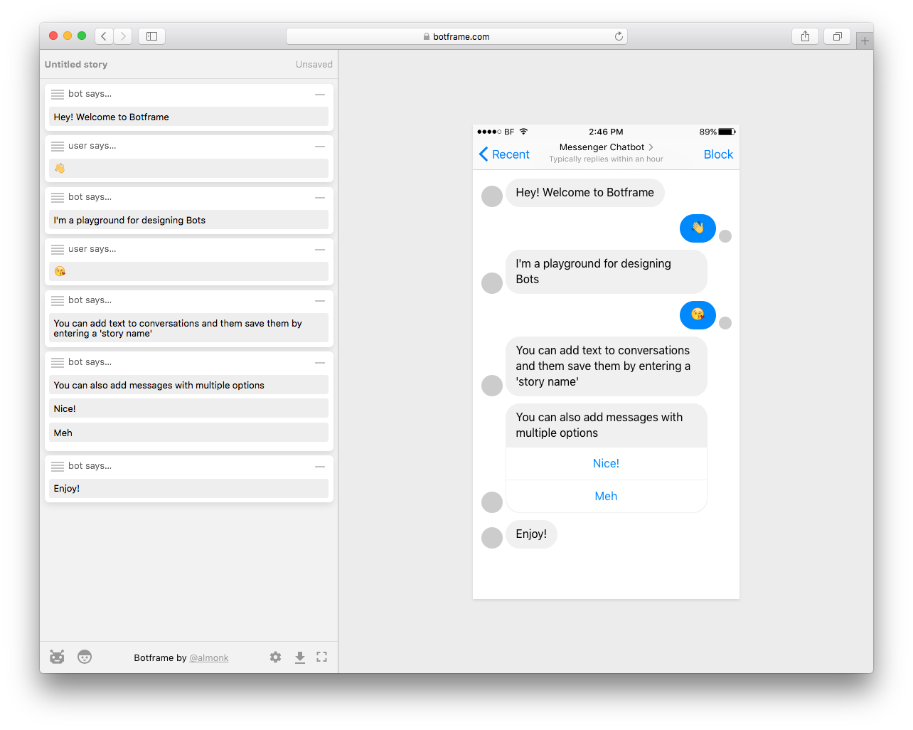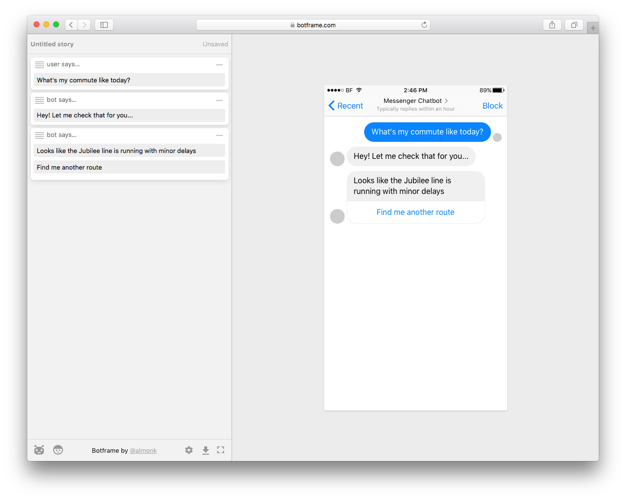 Botframe is a specialised design tool to create bots. Anyone who's had to design a bot experience in Sketch or similar will attest that it's a frustrating experience. Botframe does away with the clumsiness of visually designing a bot interface and instead let's you focus on creating structured data which can be previewed in situ or downloaded as an image.