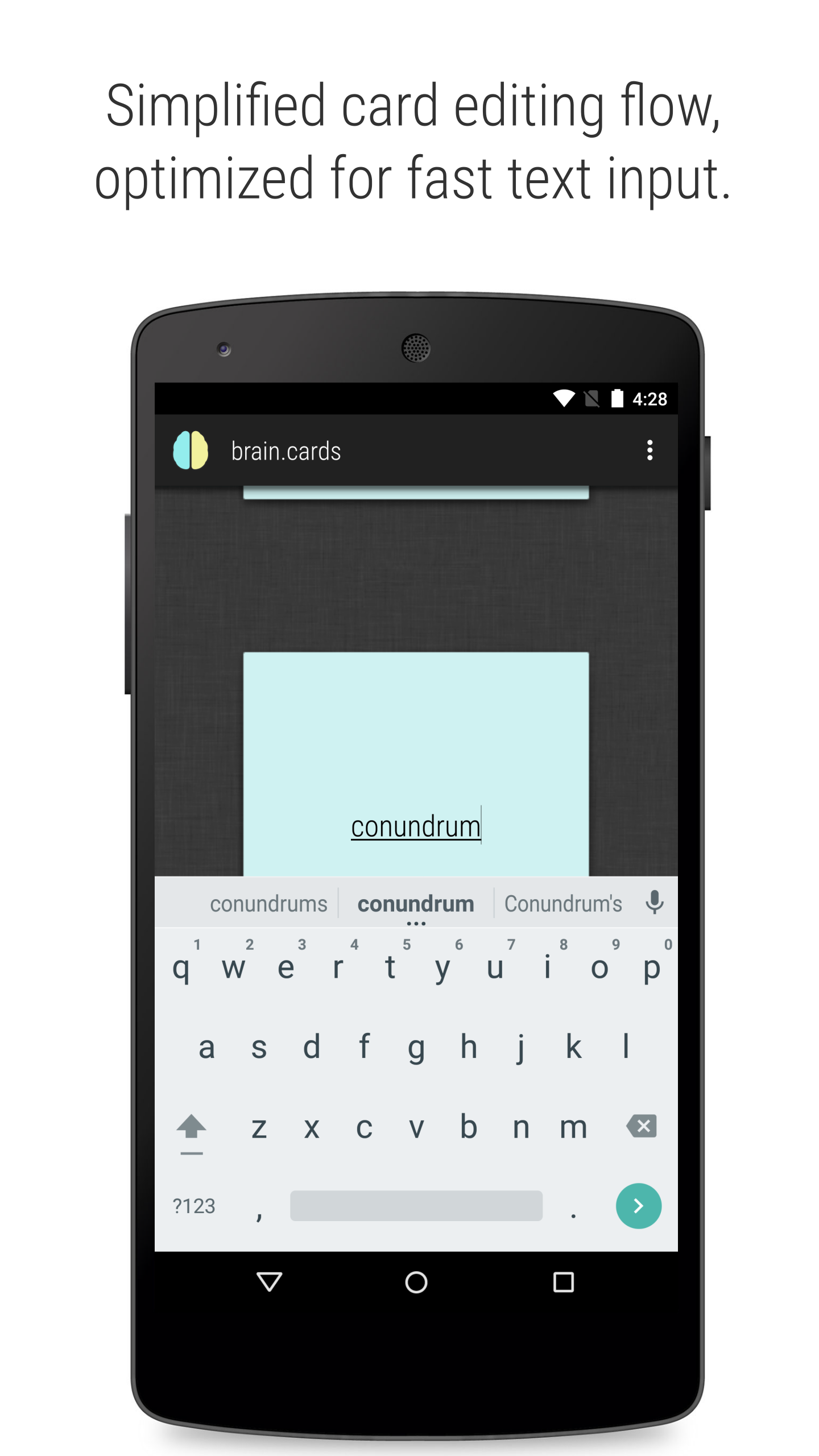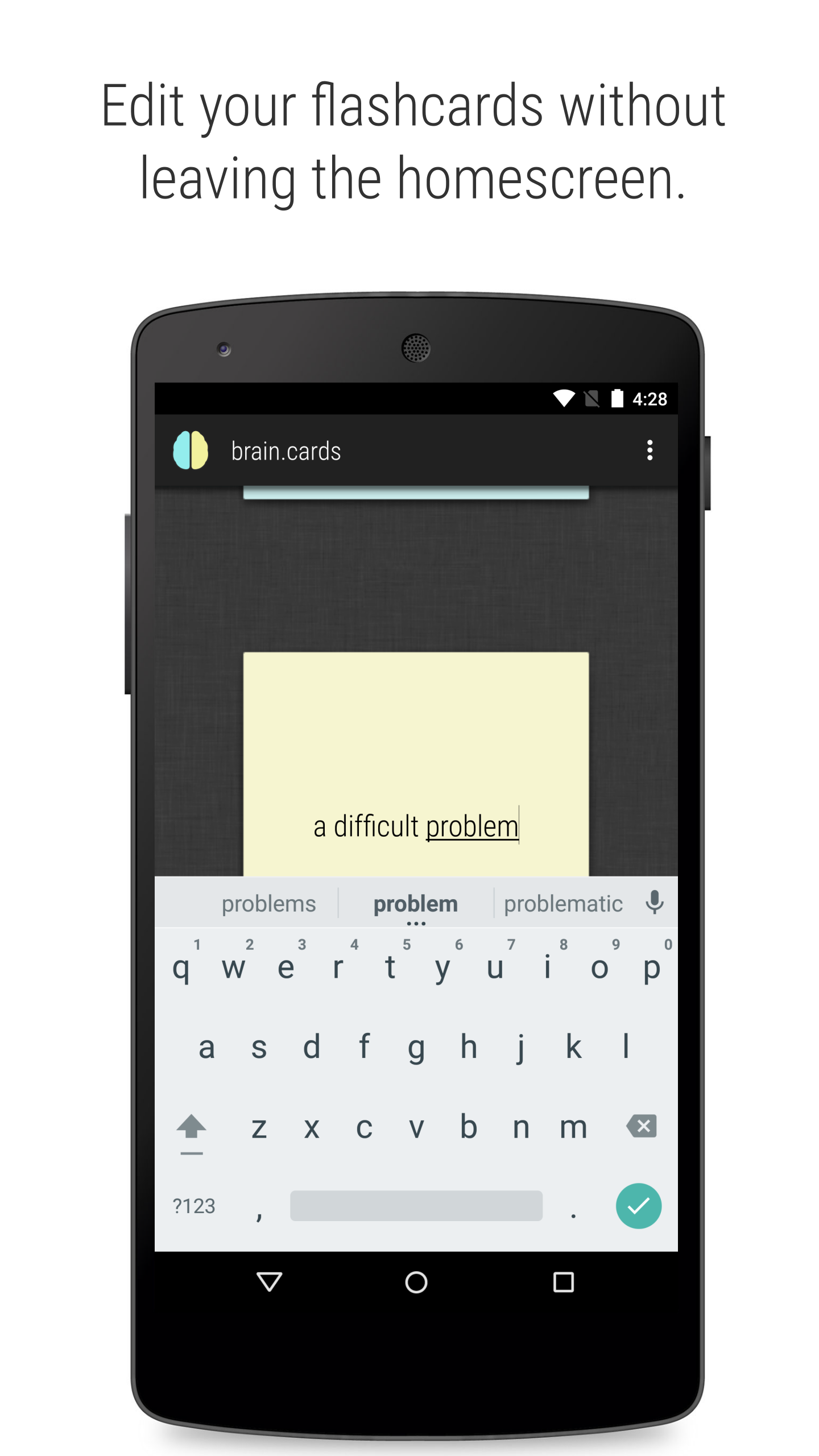 Write down whatever you want to memorize -- formulas, dates, events, sales figures, pin codes, credit card numbers, whatever you want. Don't worry about organizing it. Whenever you have a spare minute, just swipe through your flashcards and the app will automatically rand… See more