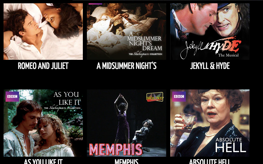 Broadway HD has stuff that nobody else has. They also have a fair amount of stuff that has nothing to do with Broadway. It's also stuff that I can find on other platforms. They do have a section for stuff that is new, but they don't have a section for stuff that's going away. So if there's something you might want to watch later it might disappear without warning.