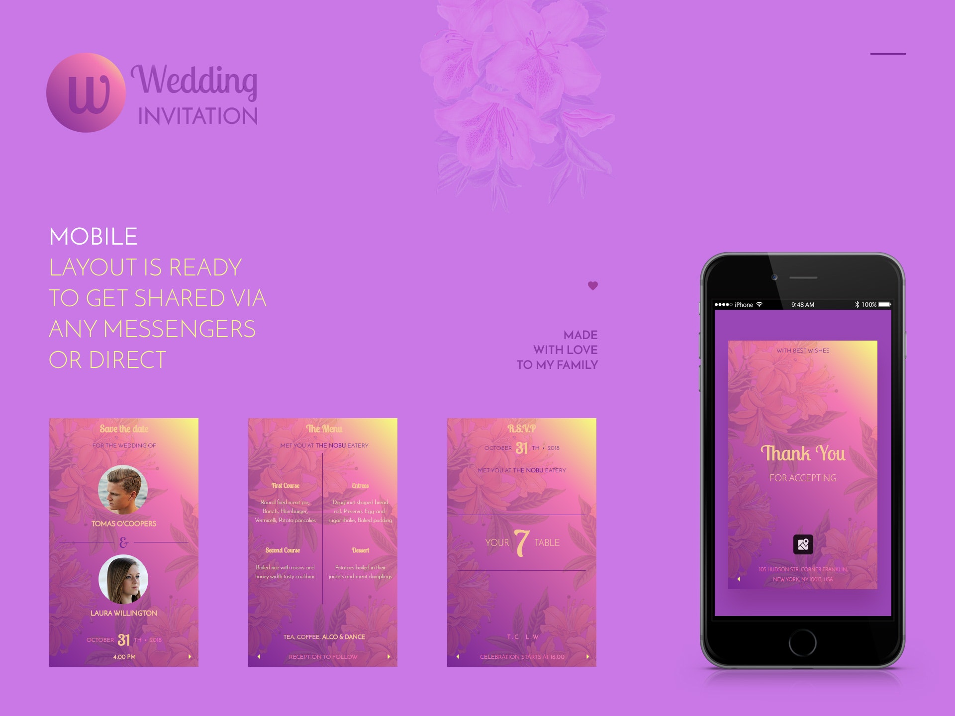 That's an idea to jump from printed wedding invitation to online. You can download this pack and simply edit some details, then upload it to your host and share to people whom to invite. Hope to feel some demand here, that'll motivates me to develop more templates based on UI above. Thank You.