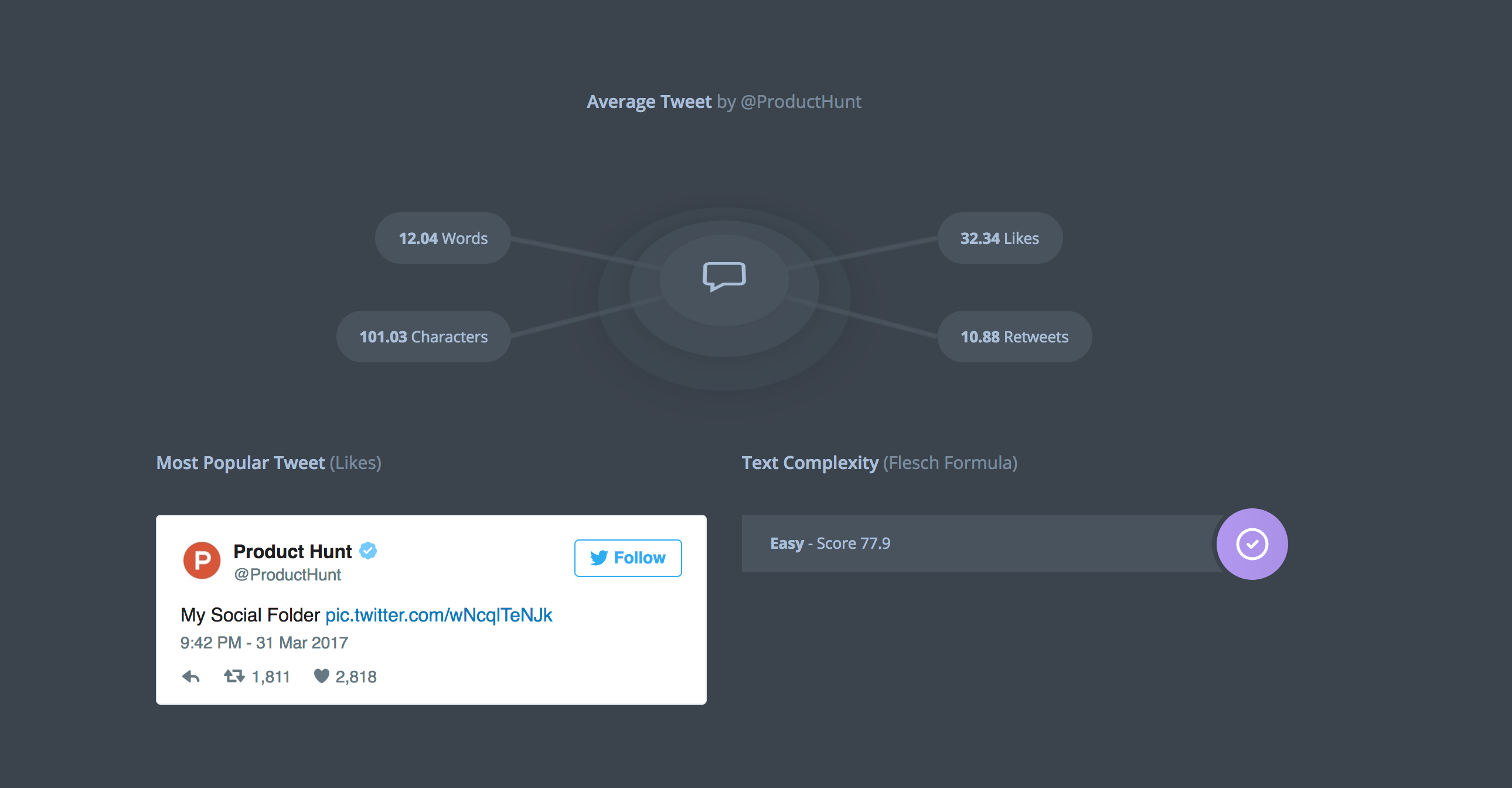Looks really nice and neat. Yet, don't really understand what the circle part under Most Popular Tweet and Text Complexity stand for.