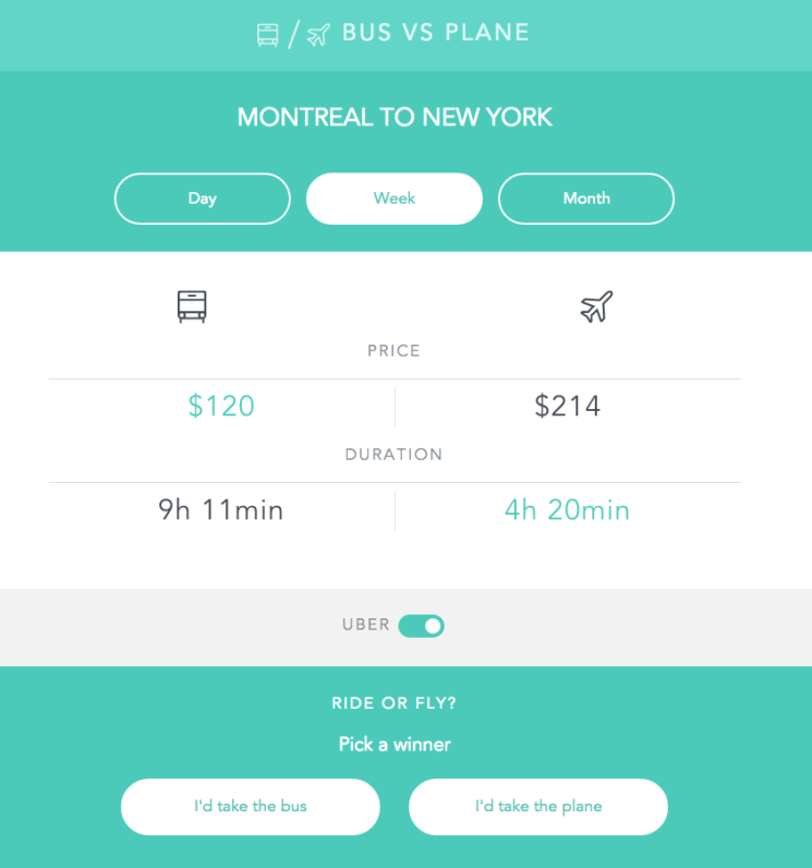 Hello Product Hunt 👋 We built Bus vs Plane during a hackathon @Busbud. It combines the Busbud API and Google Flights' QPX Express API. It helps you decide between taking a bus or catching a flight based on the two things that matter the most: 💰and ⏳.