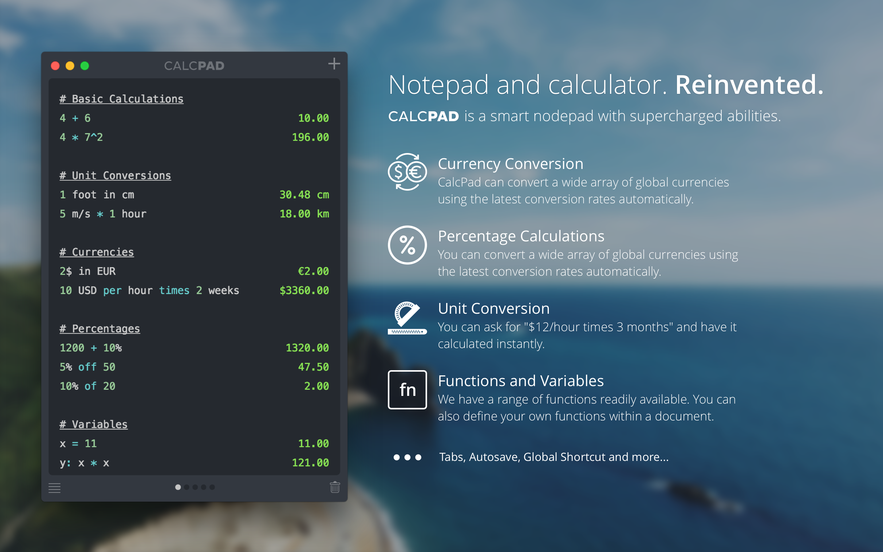 It is a tiny utility application that sits on your menubar and accessible with a global shortcut. It basically acts as a calculator if the input is an expression and a notepad otherwise. There are tons of defined units and live currency data that it can convert between. In case you need more than one documents to work on, we have tabs and a summary view.