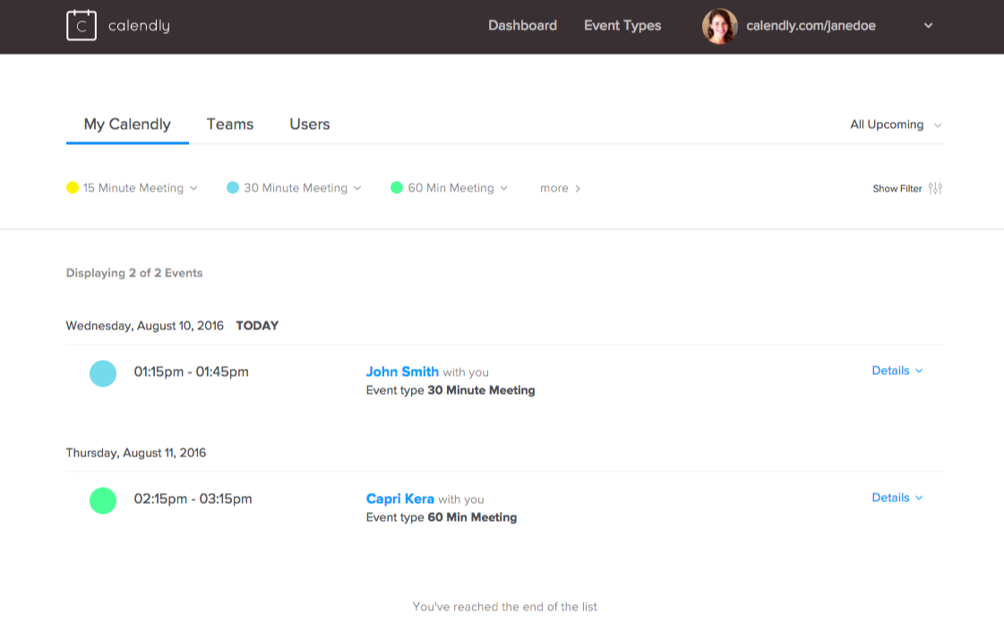 I've been using YouCanBookMe for a while and am switching to Calendly as it just feels more elegant and well-executed. Well done, team. Nice work.