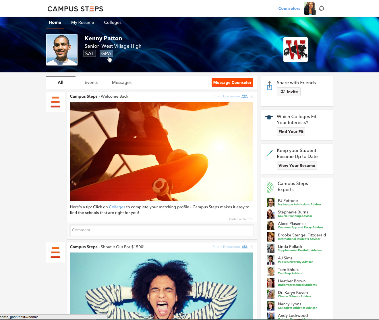 Connect with students and view their academic resumes and college goals