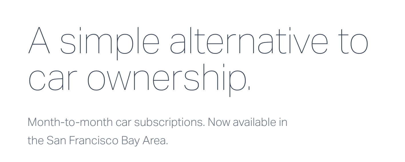 We just launched Canvas on Friday and are now live in the Bay Area. Canvas offers a month-to-month subscription to a car that includes insurance, maintenance, and warranty coverage.