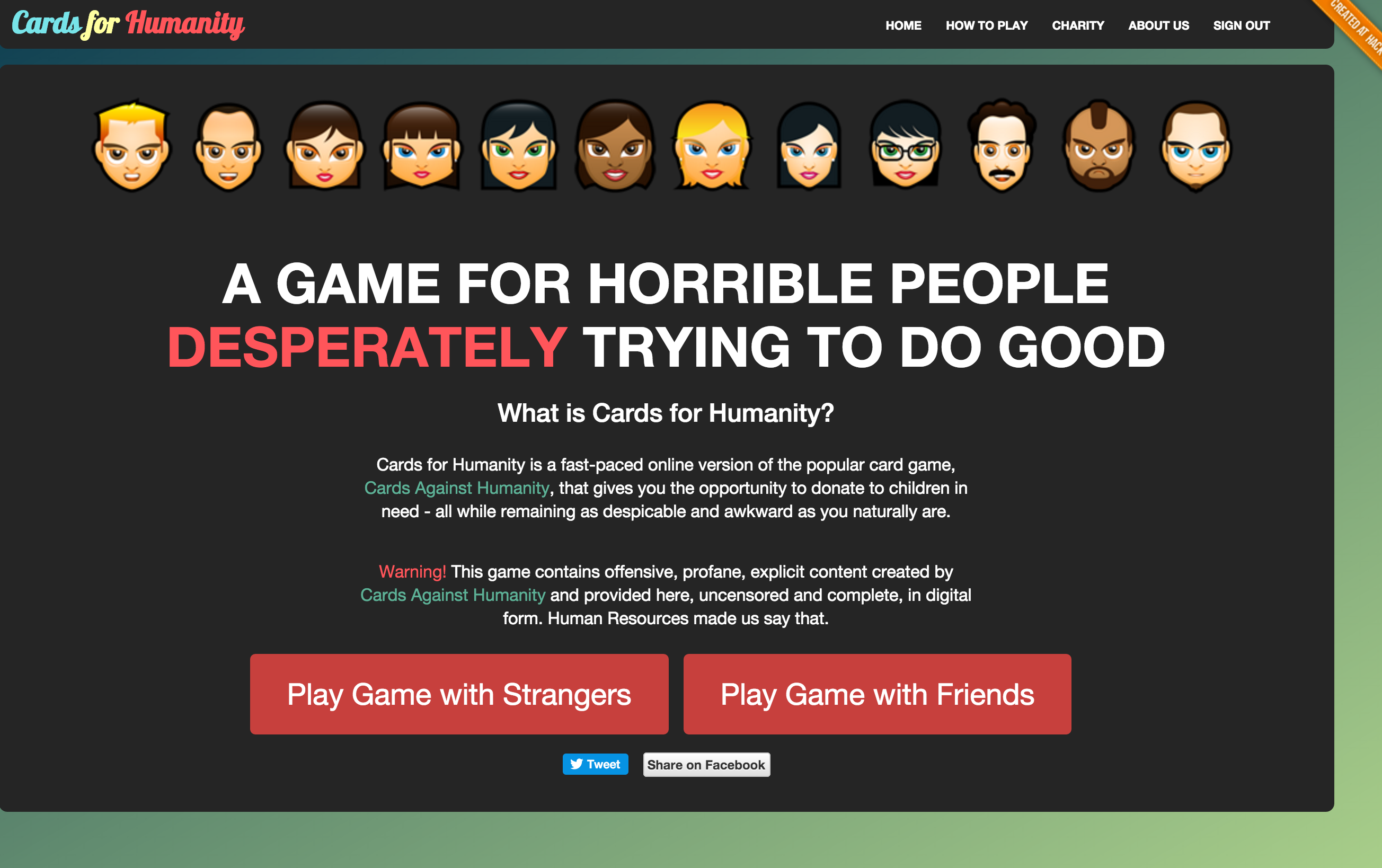 So much fun and gives you the opportunity to donate to a great charity! "Cards for Humanity is a fast-paced online version of the popular card game, Cards Against Humanity, that gives you the opportunity to donate to children in need - all while remaining as despicable and awkward as you naturally are."