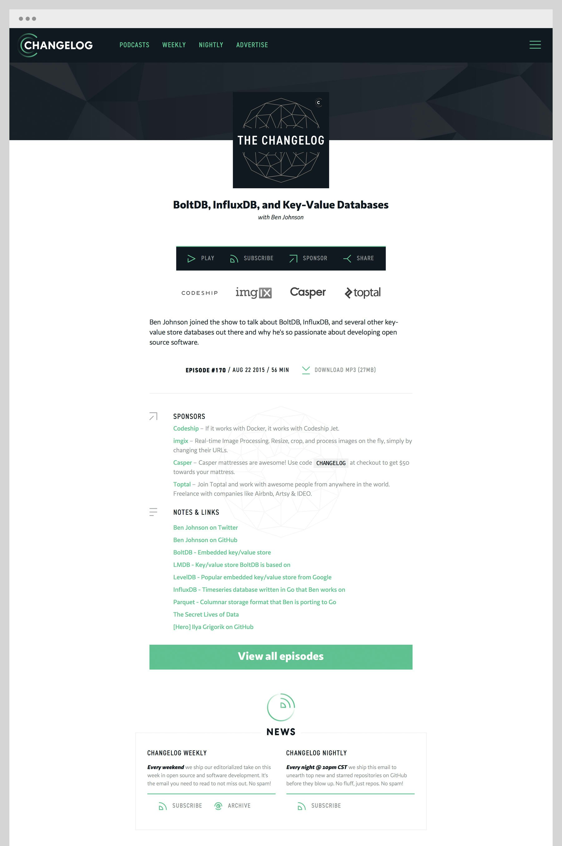 We're known for our podcasts The Changelog, Go Time, Request For Commits, and Founders Talk. We also ship a few popular emails nightly and weekly. Oh, and we do films too.