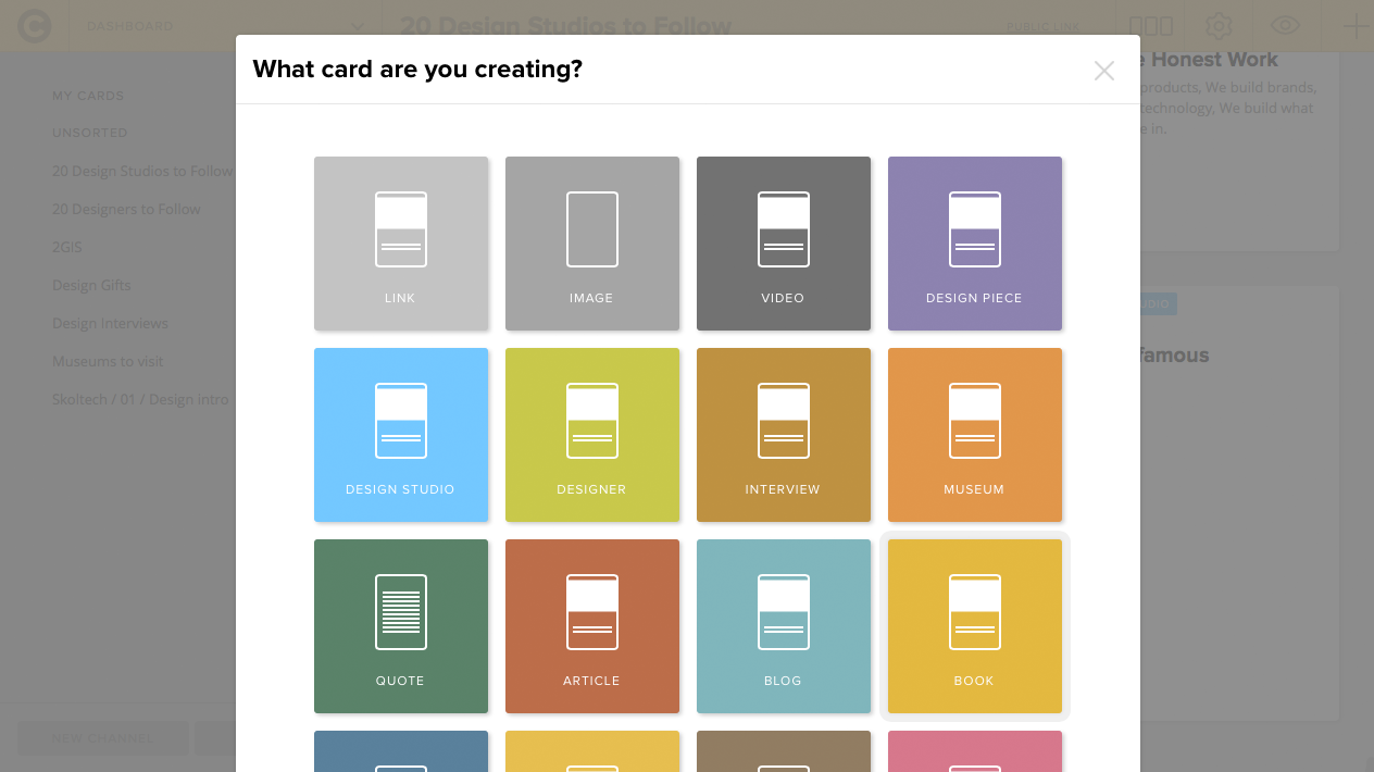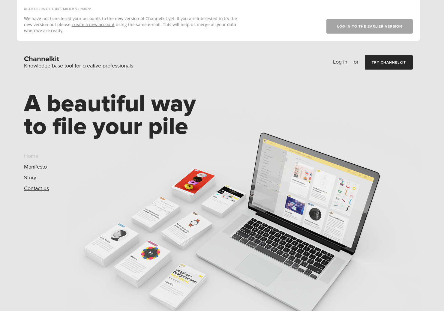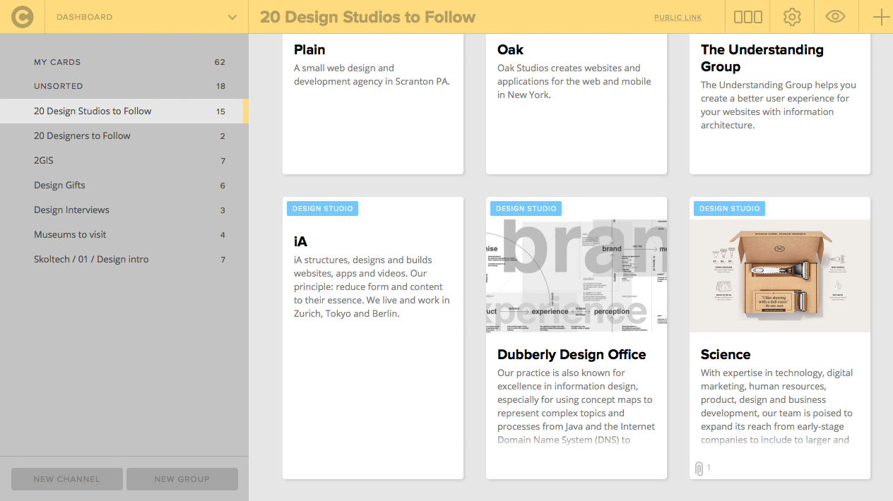 Channelkit is a web tool aimed primarily at creative professionals that enables to collect and organise content of all formats (links, images, videos, files etc) into a neat visual knowledge base.