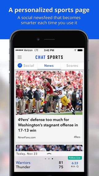 Meet Chat Sports 2.0: your personal sports page made for iOS 8. Choose teams and follow friends to get every relevant article from ESPN, Bleacher Report, local papers, and blogs. Follow play-by-play for multiple games on a single screen and check out Live Hub for scores delivered straight to your newsfeed.