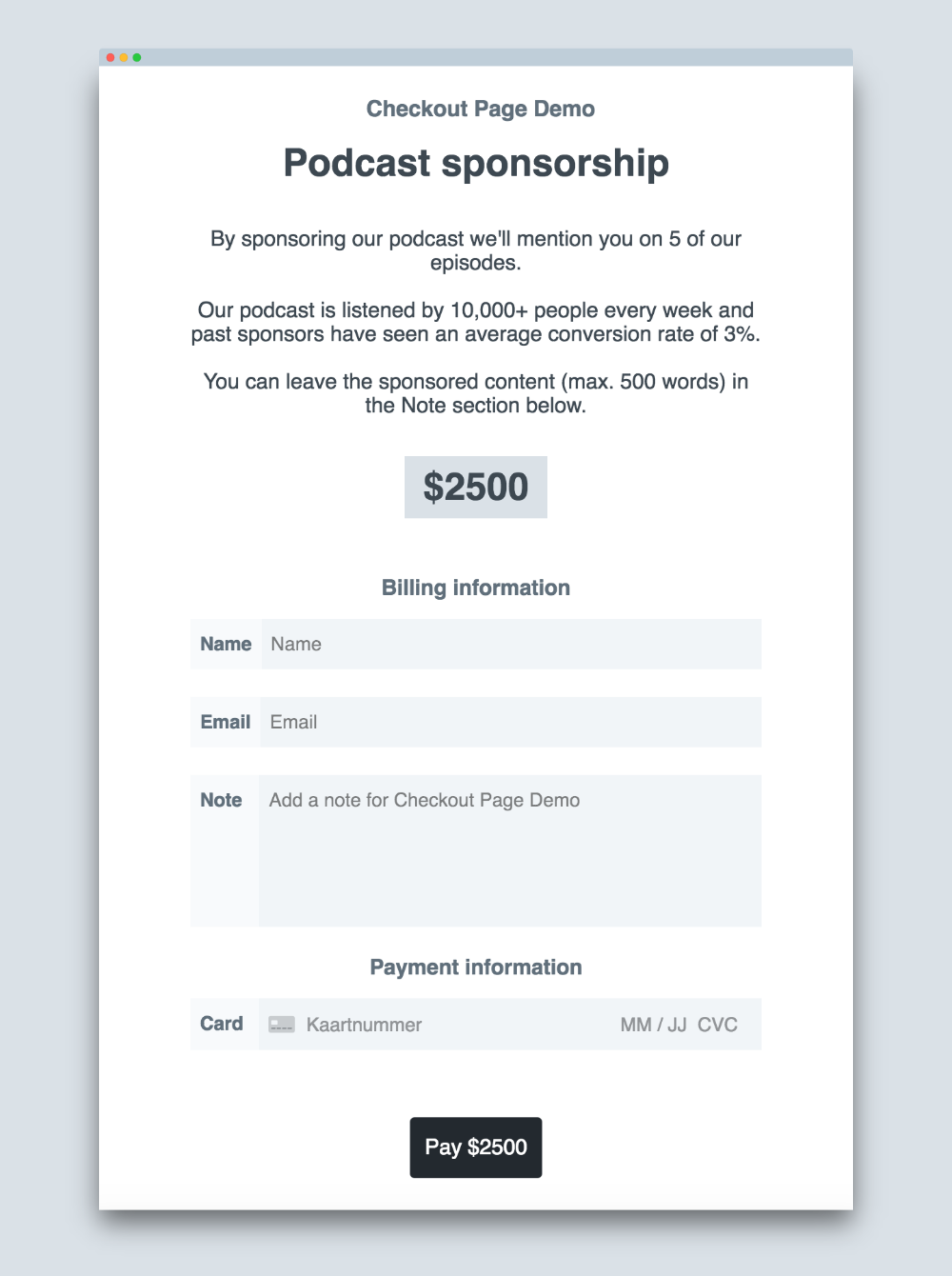 See an example page here: https://checkoutpage.co/checkout...