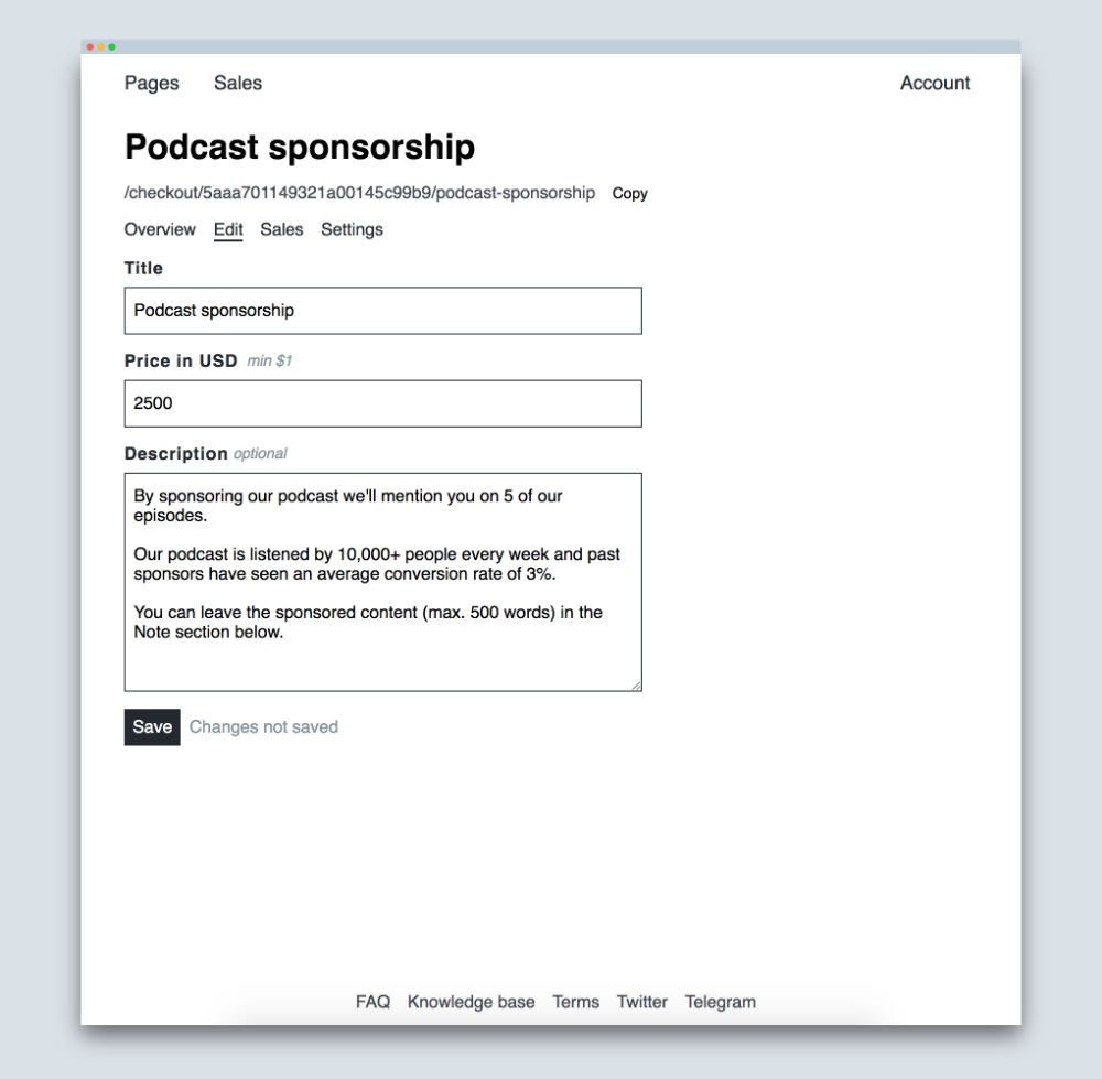 The initial inspiration to build Checkout Page came from @misterparker, who was looking for a way to quickly spin up a site to get a customer to pay him on. Checkout Page is for the people who want to start selling within in a few minutes, who don’t want to move their whole billing setup and who don’t want to be locked into a payment service.