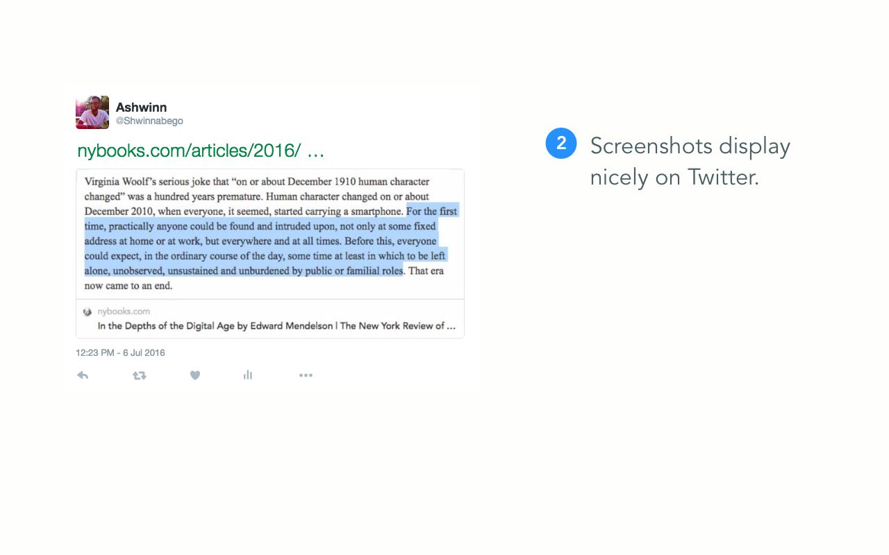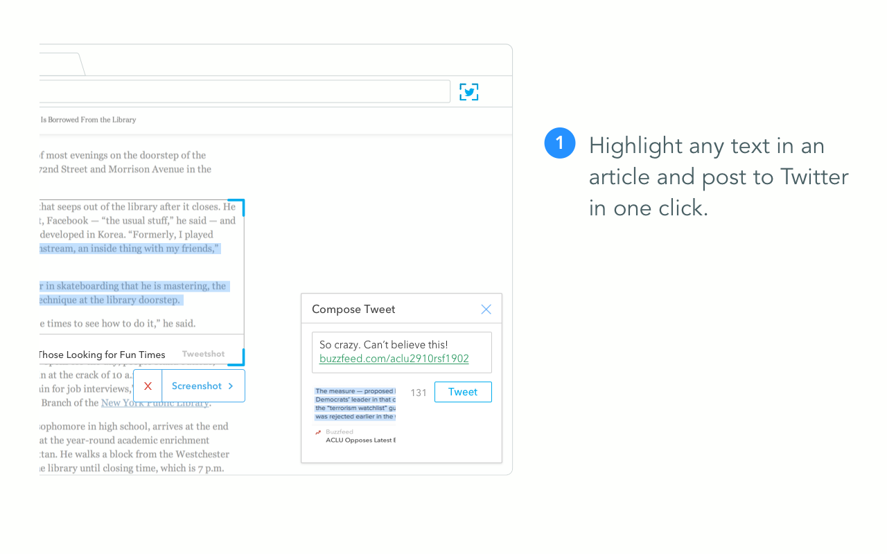 @Philly__D and I have been working on this for a couple of weeks. It’s a Twitter-powered chrome extension that lets you highlight, screenshot and tweet in one-click from any webpage. Additionally, when you follow a link from Twitter, the relevant tweet and replies will show in a sidebar on the page, so you can read and reply without losing context.