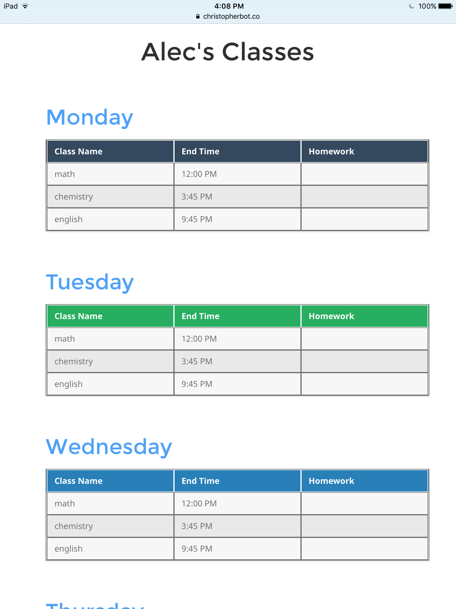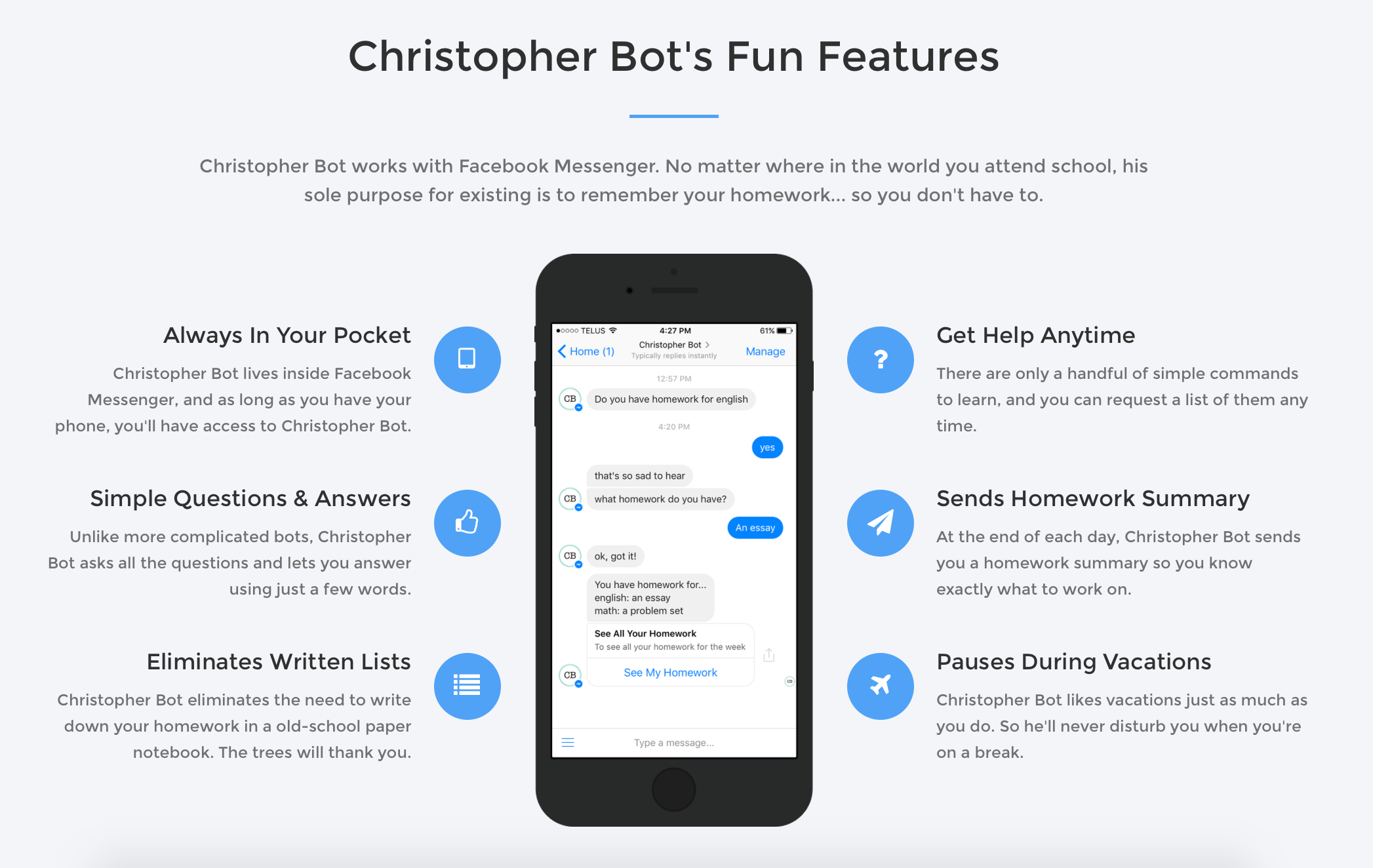 So I made Christopher Bot, a Facebook Messenger bot that keeps track of your homework. I was tired of trying to remember to write down my homewor… See more