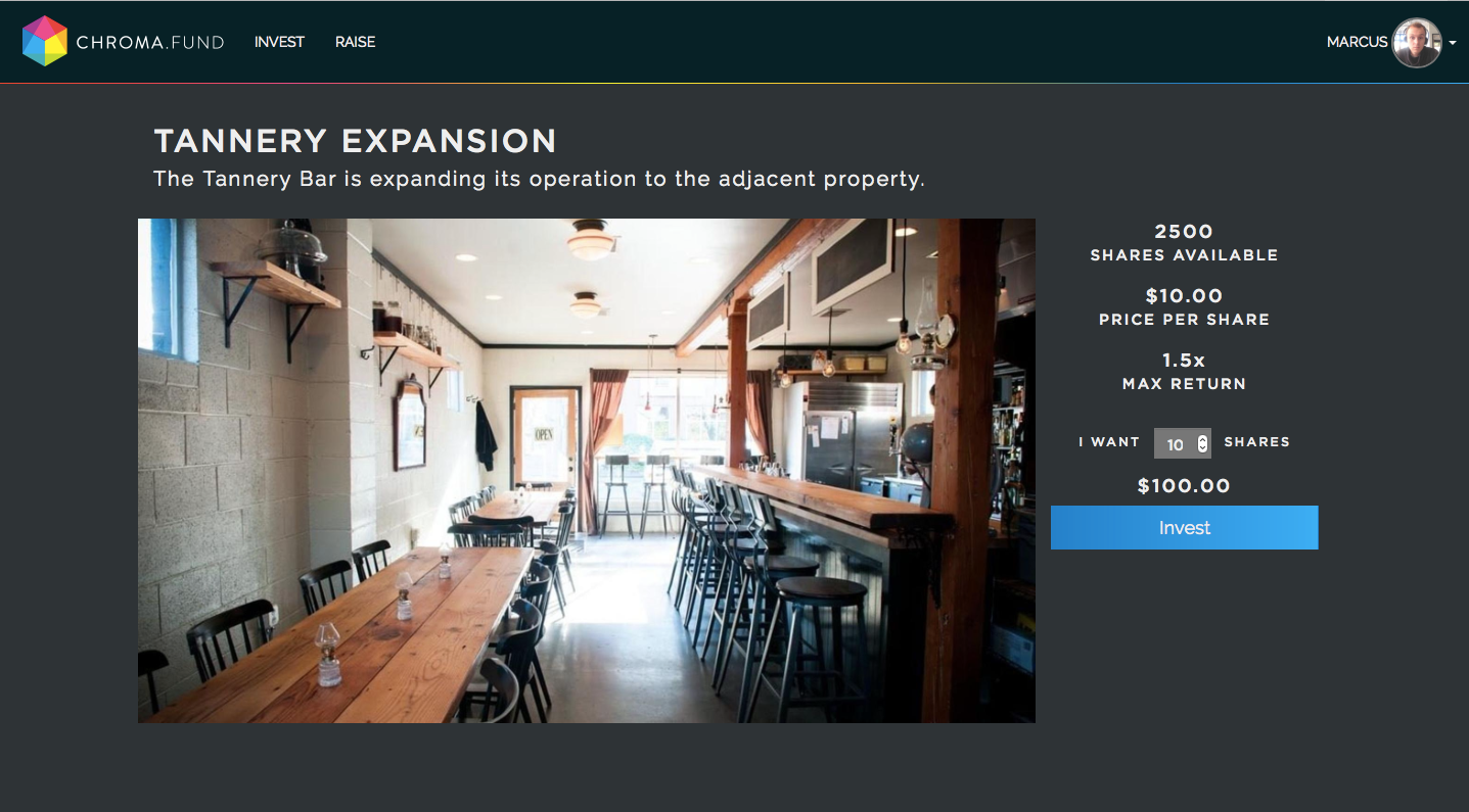 Hey! I'm one of the co-founders of Chroma.fund. Excited to be listed on Product Hunt (thanks Chris!) as it's one of my daily reads. Just a heads up, while what we're doing is pretty amazing (IMO) we are operating under a state-based exemption for the sale of securities, so we're only able to sell to people in Oregon.