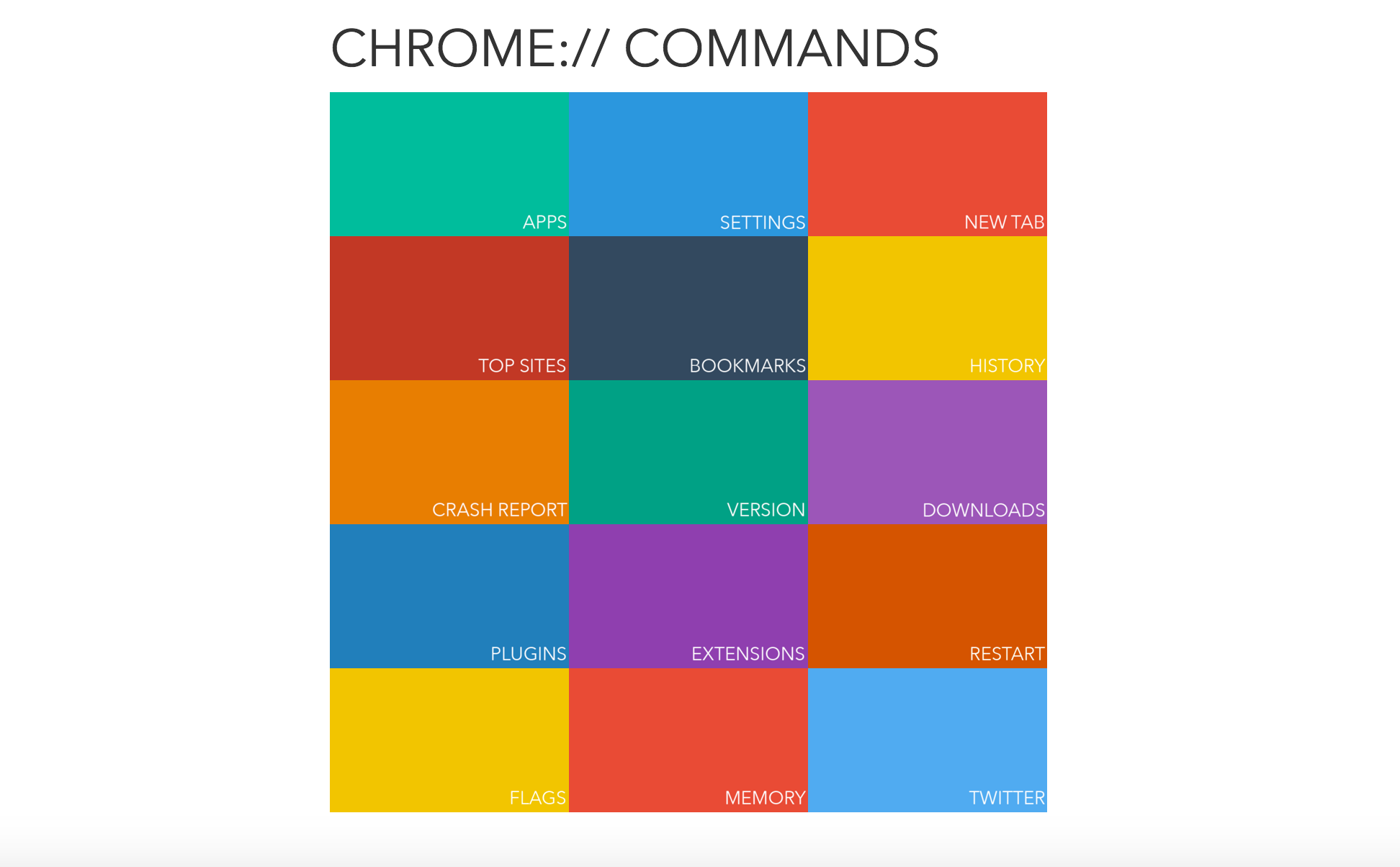 Hello everyone. Chrome Commands, chromecommands.com, is a web tool meant to help you preform actions otherwise impossible without "chrome://" and also you can use it to preform well known actions like chrome settings, chrome bookmarks, and more.