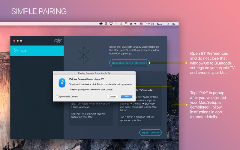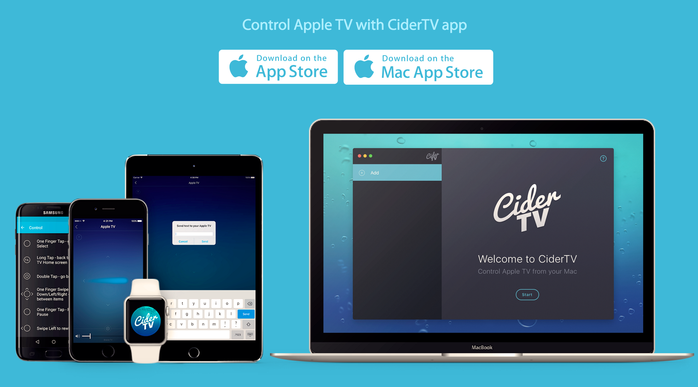 CiderTV app is a unique and smooth alternative to Apple TV / Siri Remote. It is available for iOS, Android, Mac OS and Apple Watch. It works via WiFi and behaves like native Remote app by Apple, but more accurate and responsive. And no Apple TV jailbreak is needed.