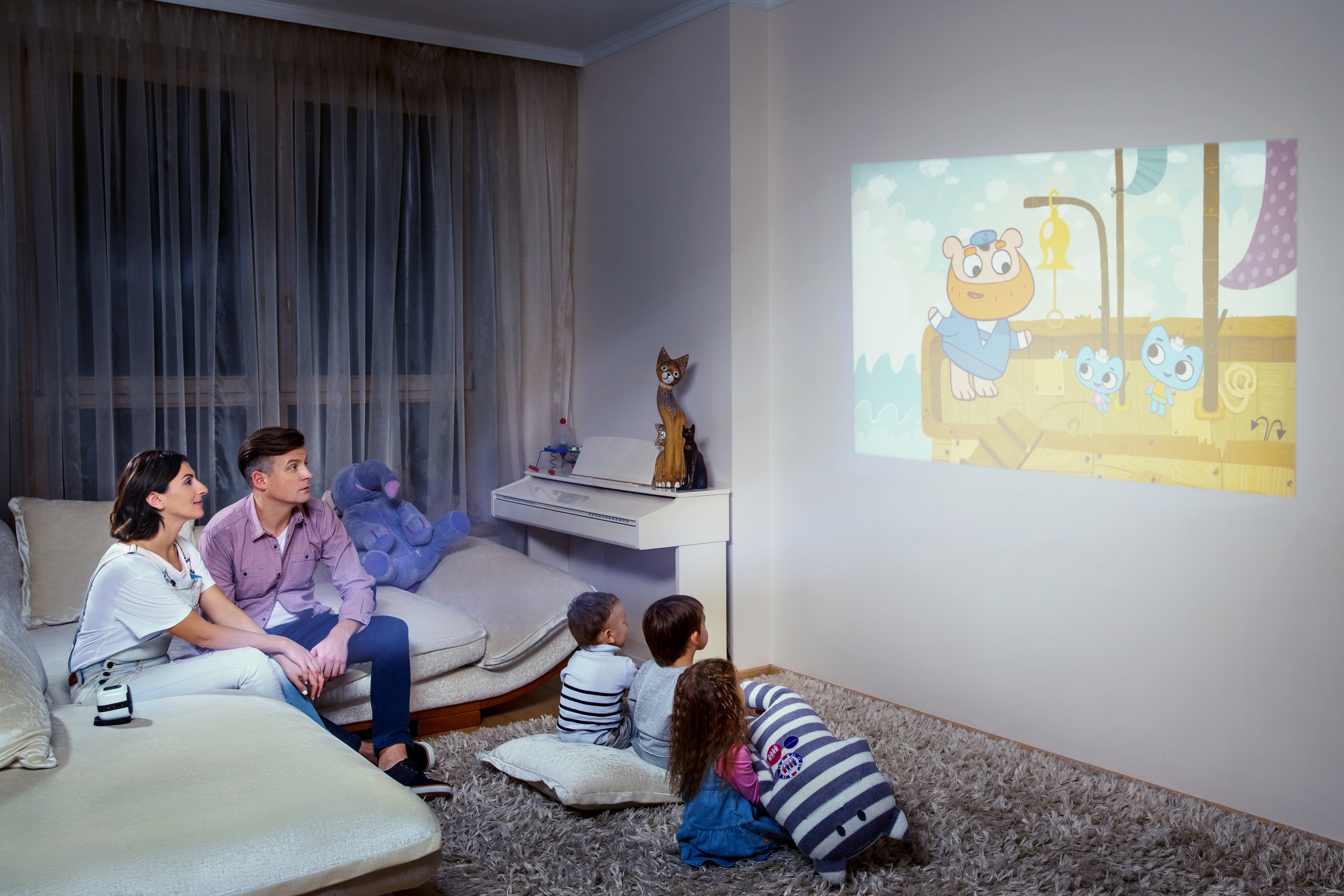CINEMOOD has parents-curated content you can project onto any light surface. Choose from a bilingual library of cartoons, audio stories, digital books, lullabies, and shadow puppet show tutorials.