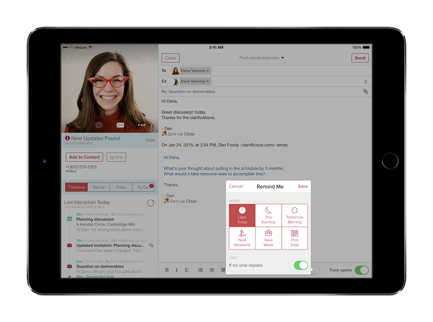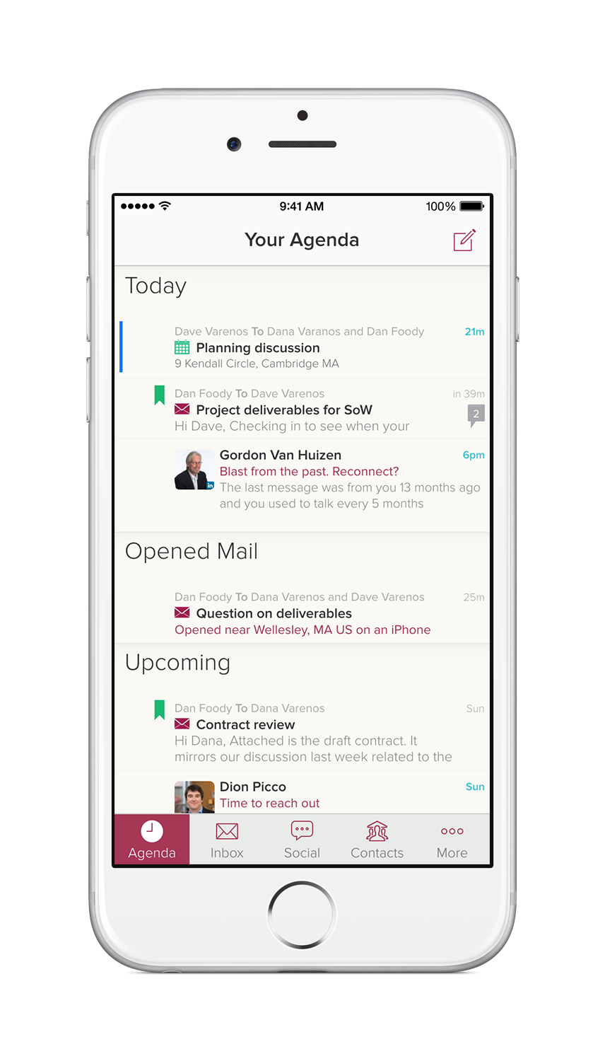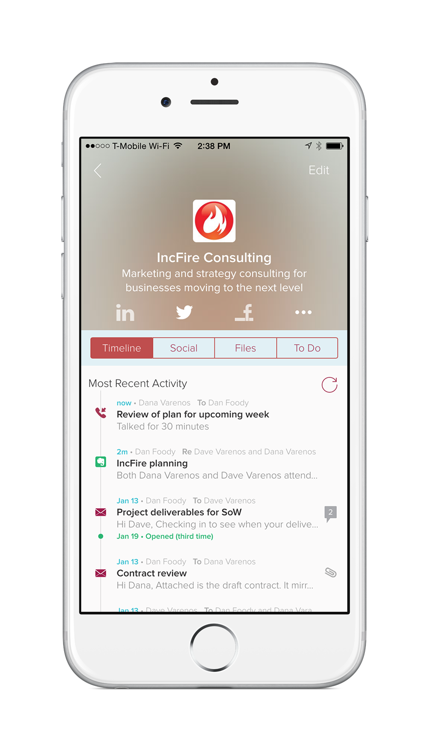 Promises a smarter view of your contacts, by allowing you to automatically track email messages, phone calls, meetings, notes, social updates, and more in a single application on iPhone, iPad and the web. The idea is to offer individuals whose business requires them to maintain relationships an easy way to receive reminders to reach out to those most importa… See more