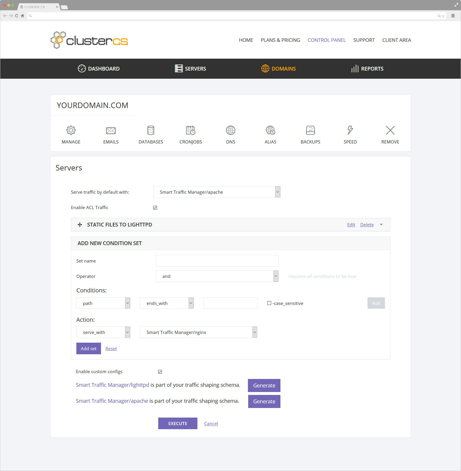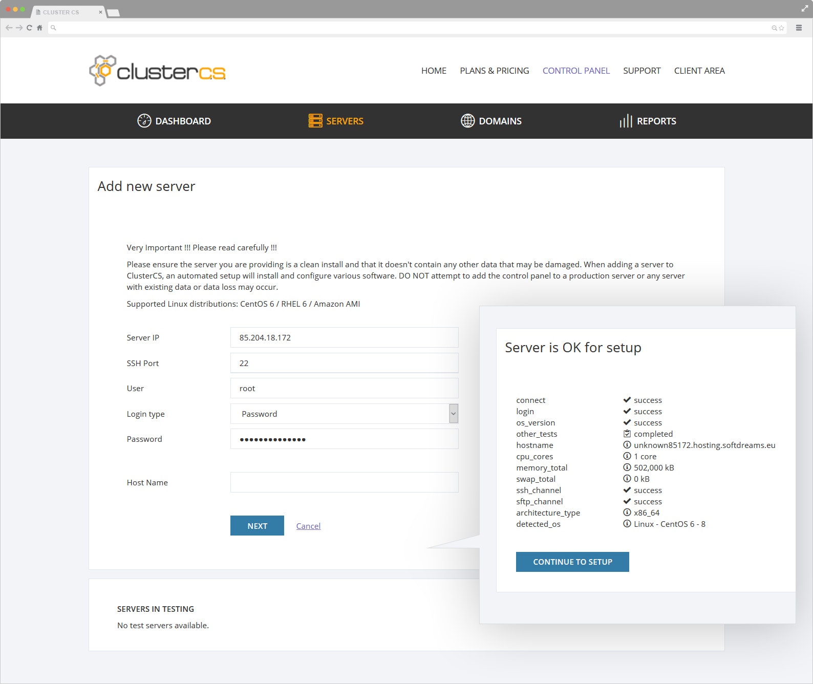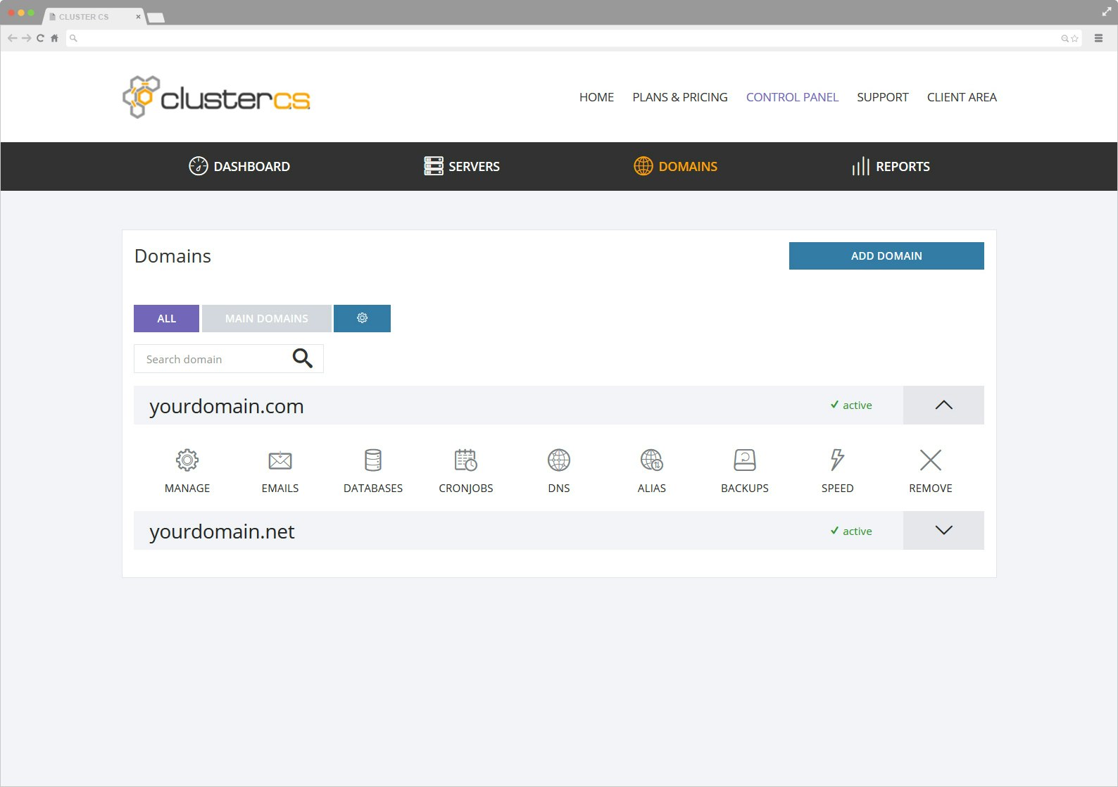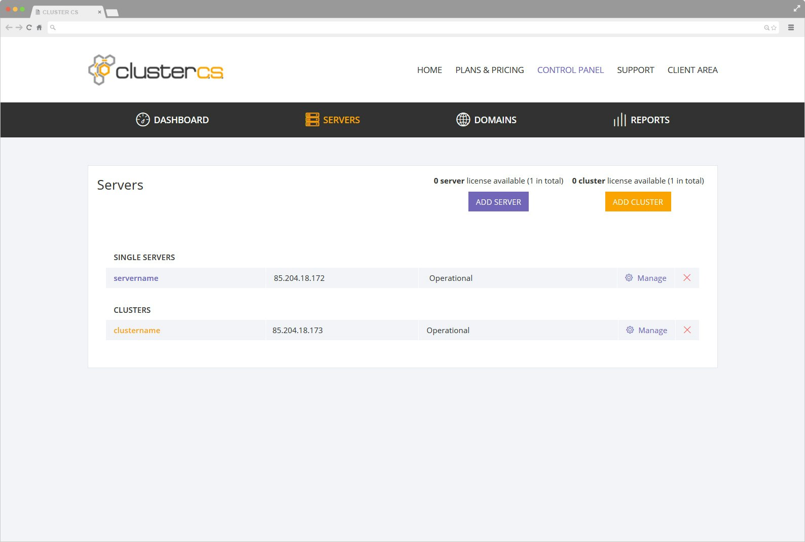 ClusterCS is a Cloud-Based Linux Control Panel with an easy to use GUI. The software is compatible with any type of VPS or dedicated servers and it simplifies the whole process of server and domain management. The panel comes with two layers of functions, servers/domains configuration and management and Advanced High Availability Clustering.