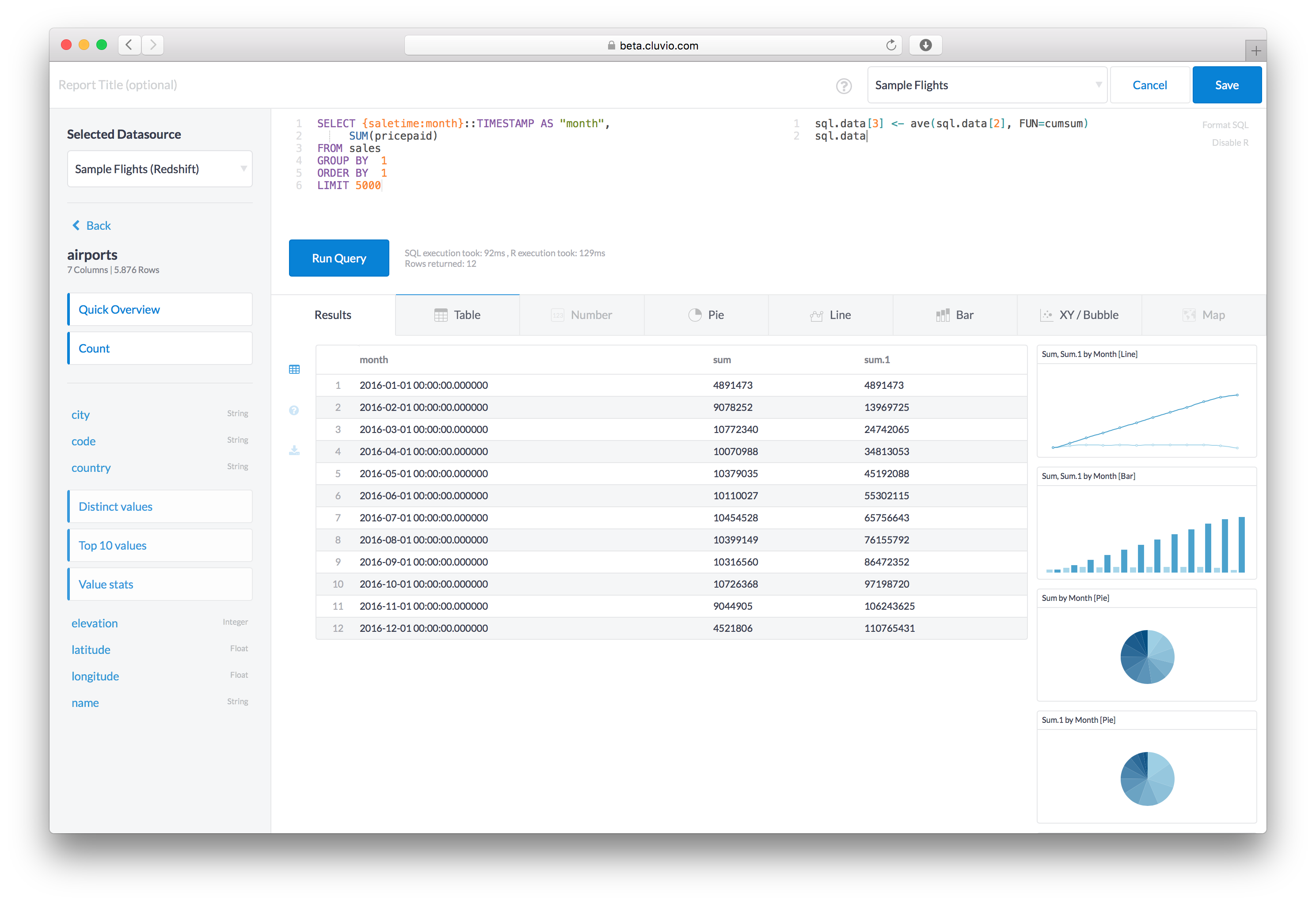 We have integrated an R engine in the pipeline, so you can run custom R script on the sql results to get combined power of SQL and R.
