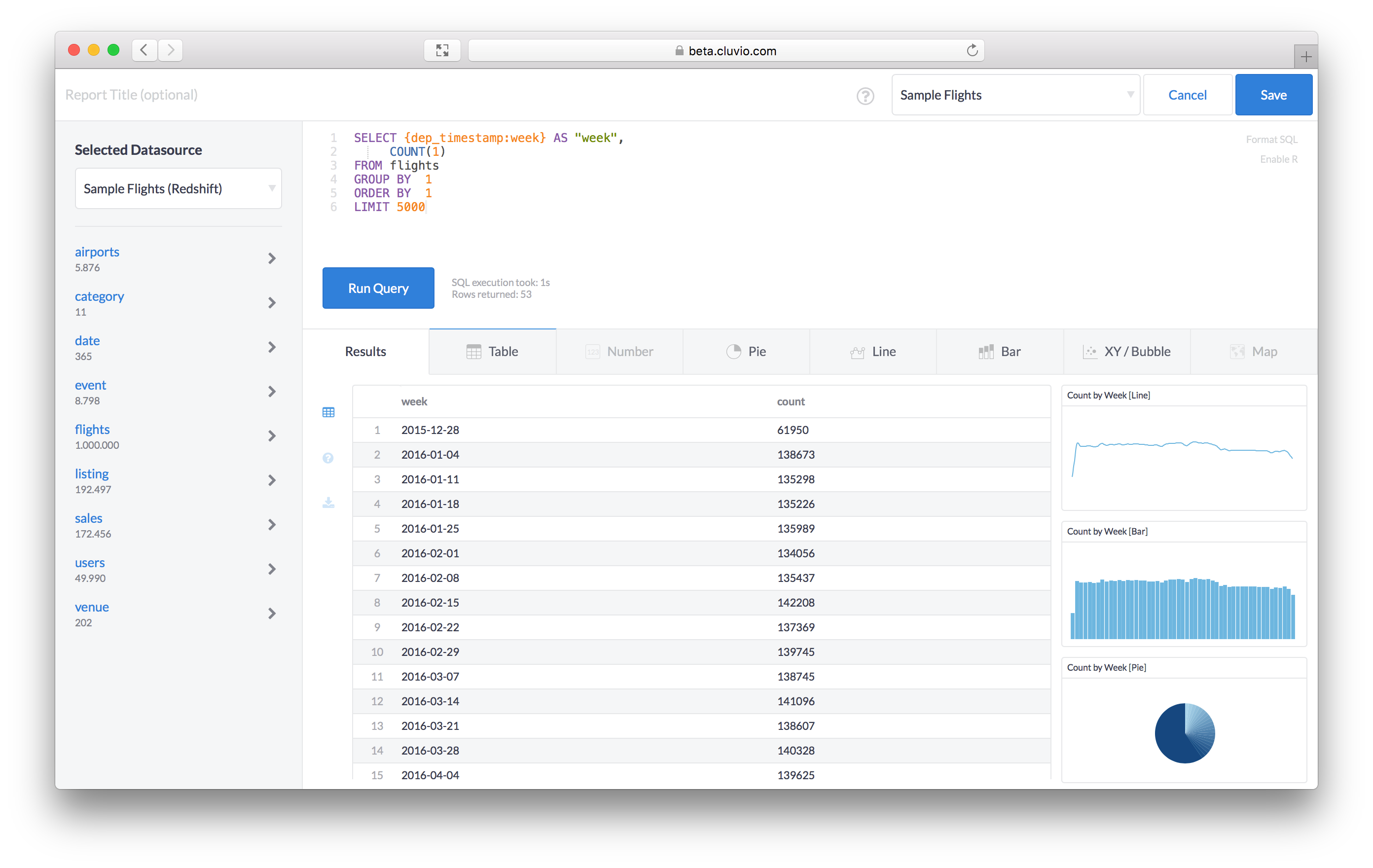 Cluvio allows you to run SQL queries against your database, visualize the results as beautiful dashboards and share these dashboards within your company.
