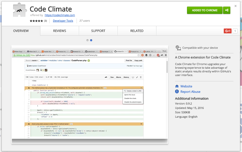 Hi Product Hunters! I’m Bryan, the CEO and co-founder of Code Climate… We’re really excited to introduce our new browser extension for Chrome, which brings static analysis and test coverage information directly into the GitHub user interface.