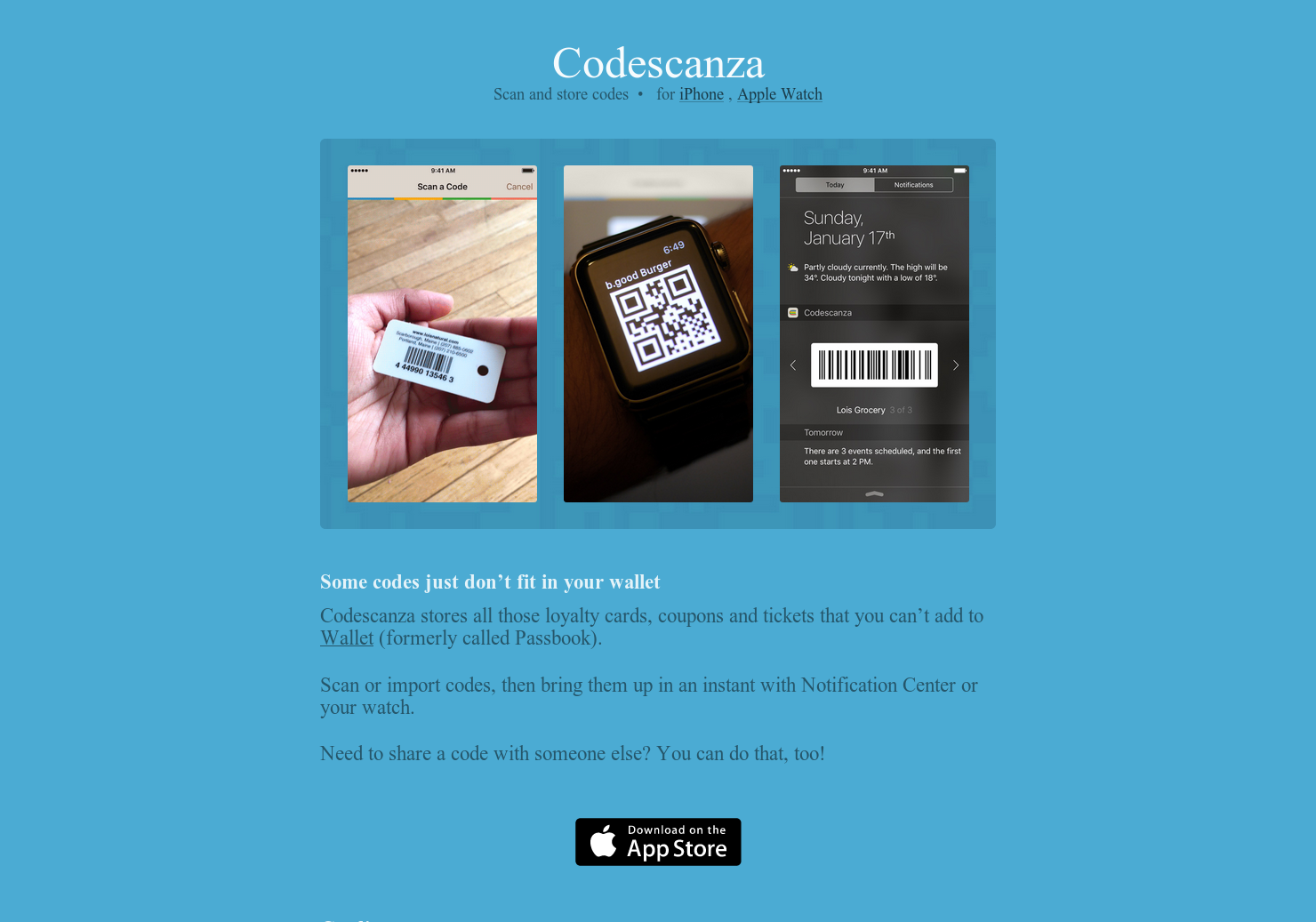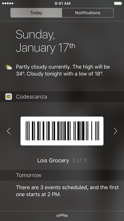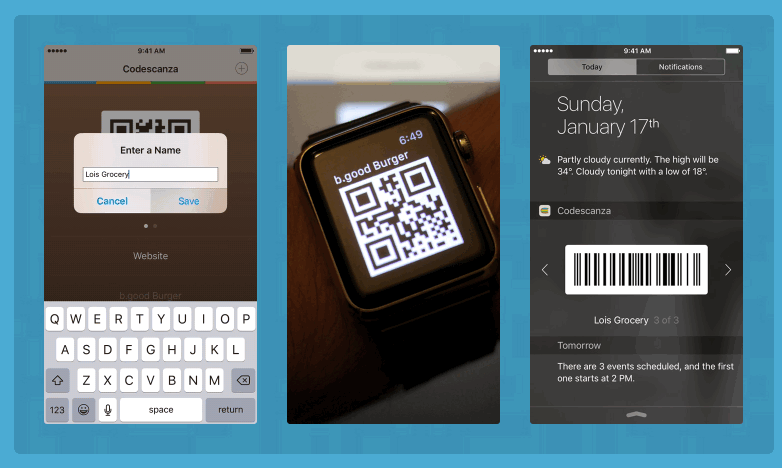 I’m Justin Velgos and Codescanza is an app I designed for scanning and storing all those loyalty cards, coupons and tickets that can't be added to Wallet (Passbook) so that they can be accessed from Notification Center or an Apple Watch.
