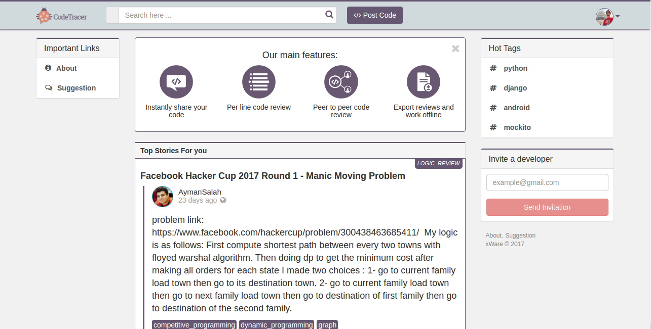 Currently, We are working on our next feature that will be ready by 01/05/2017. Our next feature is Code Refactor. It will enable developers to refactor code online on the same page and all users can check the different refactors on each file.