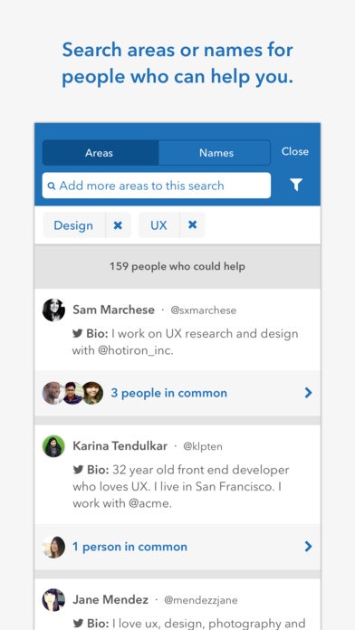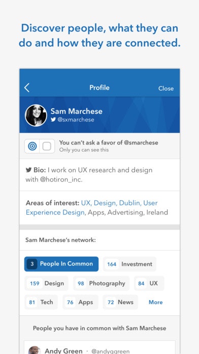 It does this by conducting network analysis, detecting areas of interest and potential expertise, by looking at publicly available data, all packaged up neatly in an easy-to-use mobile app.