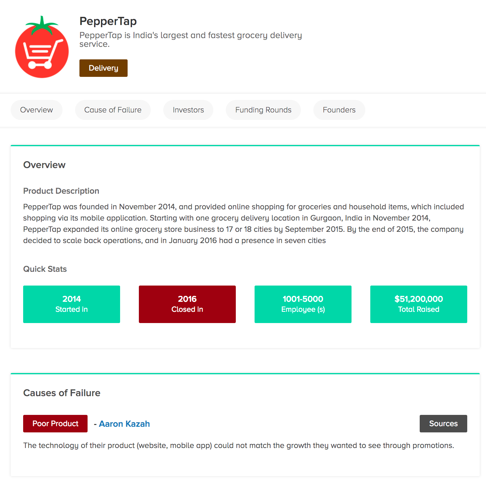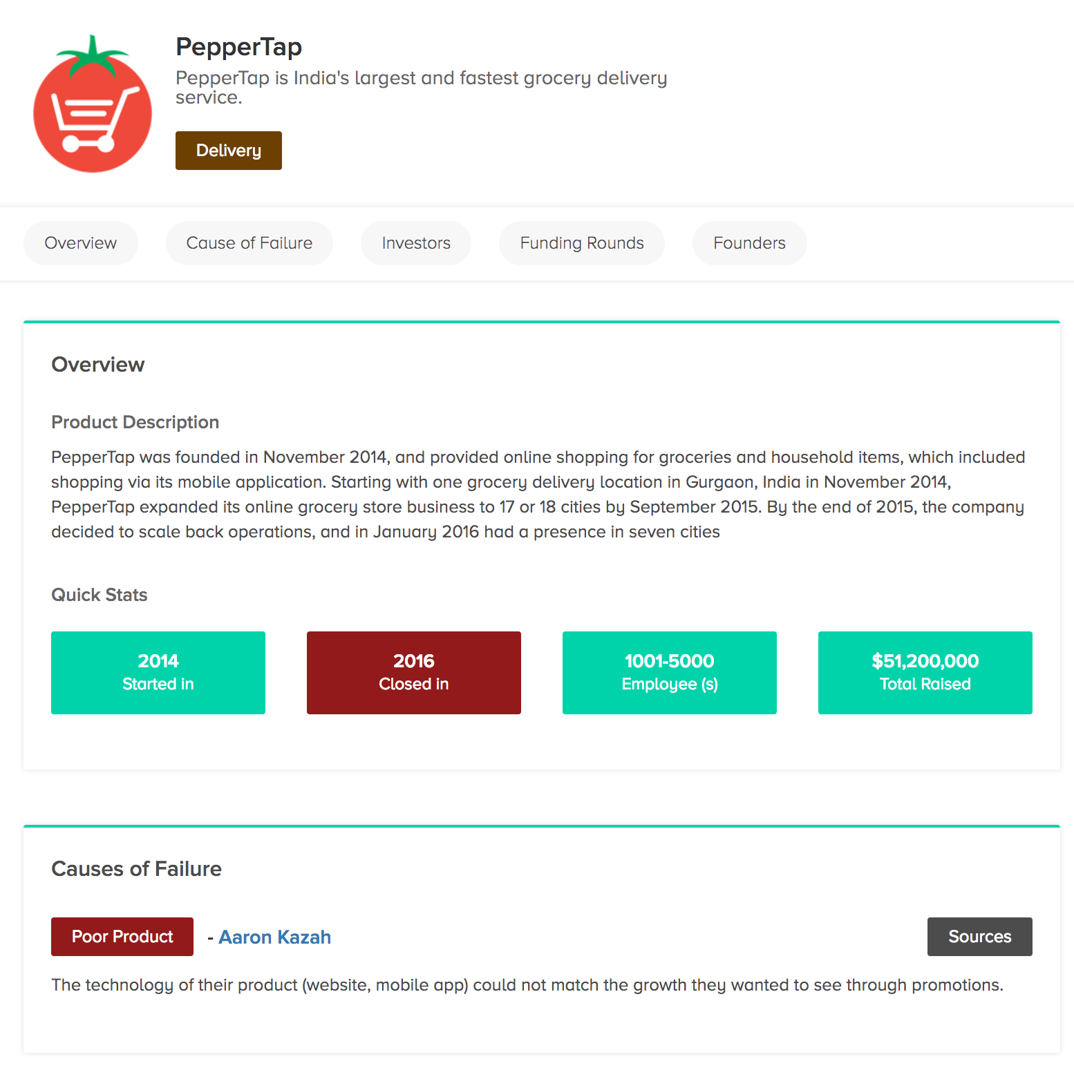 I wish the "Causes of Failure" section pulled in more direct info from the sources; maybe in a timeline (like Crunchbase) to help users trace a more accurate picture of failure over time.