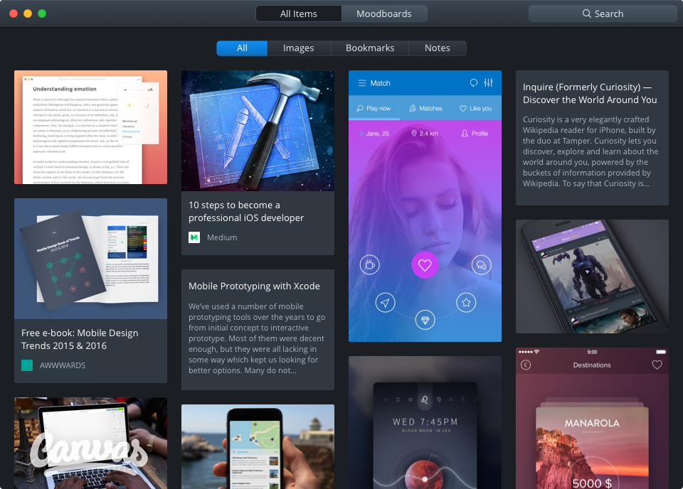 Hi, I am Dmytro, developer of Collectie App. Our application let you organize your inspiration: you can add links, images, notes to moodboards. Set tags and find items when you need them. Database stored locally now, but we would introduce synchronization in next releases.
