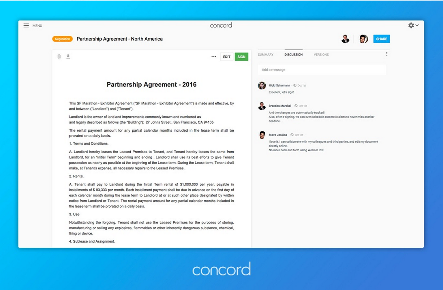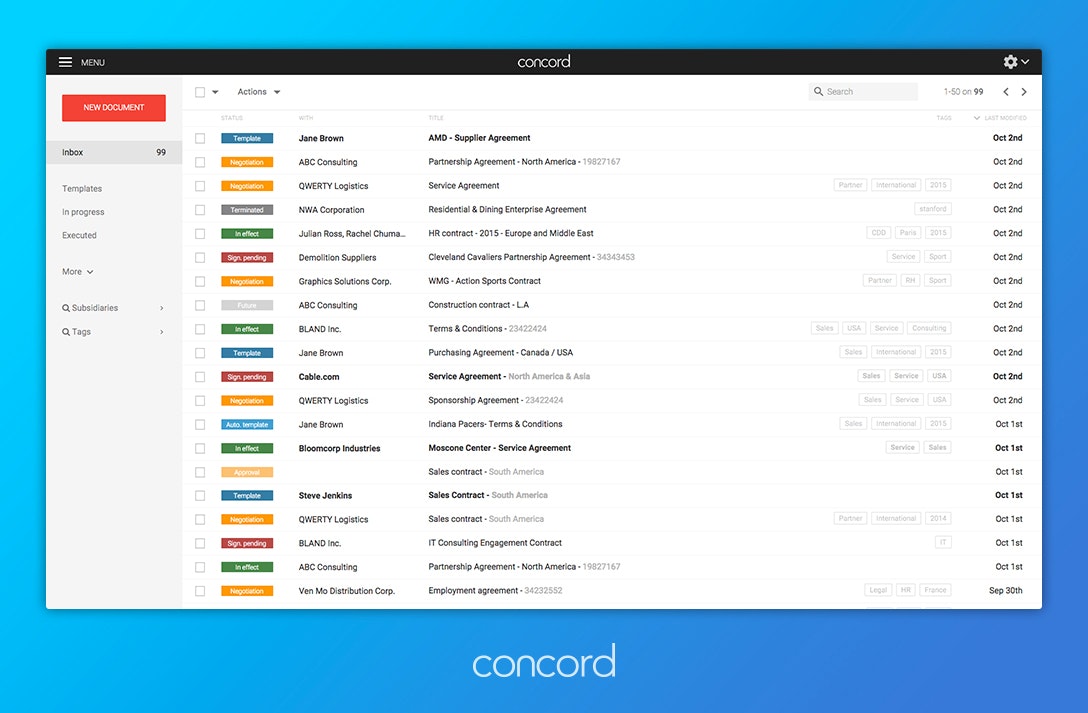 The main difference between Concord and Docusign is that Concord lets us edit the contracts online like Google Docs, and then can also automatically send deadlines alerts. The platform’s look and feel is great, we got how to use it in a sec. Maybe some strategic integrations could be interes… See more