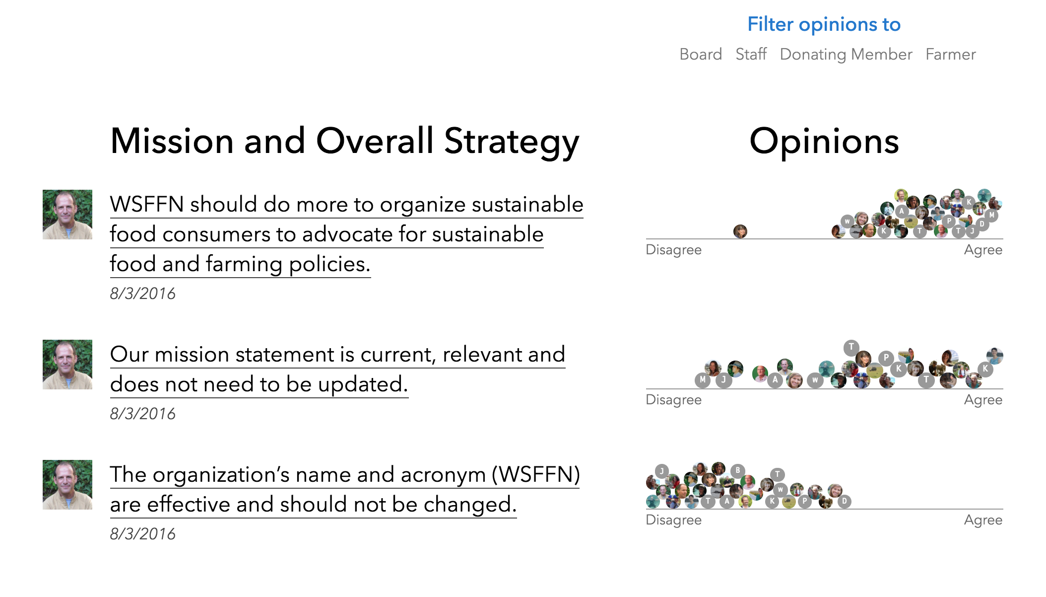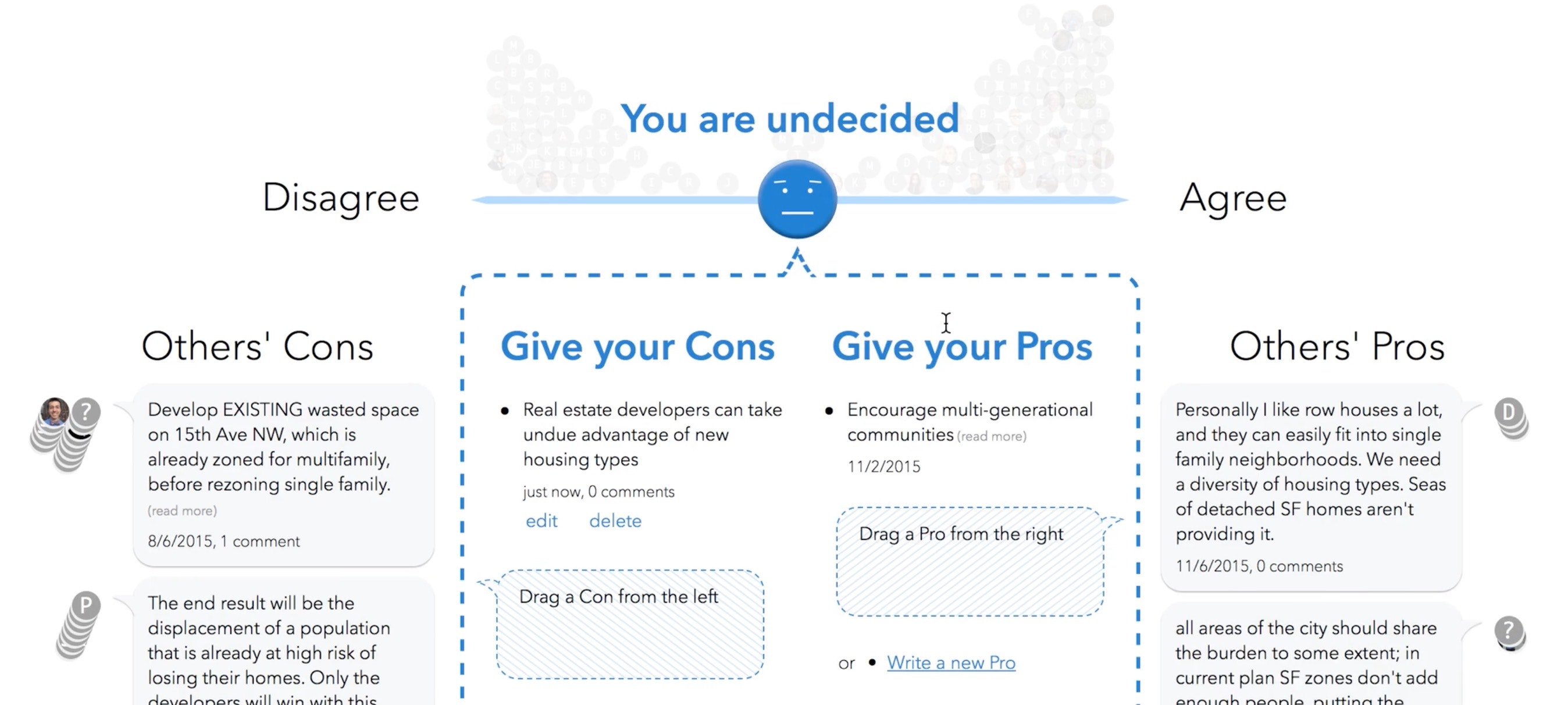 Consider.it seems like an impactful method to invite communities into discussions! Users can simply join the discussion by leaving a mark on a scale (disagree/agree). They can echo others' opinions or contribute their own. Great to see how others in the community think about matters as well. Looks like Seattle used it back in 2015 to develop a plan for their growth.