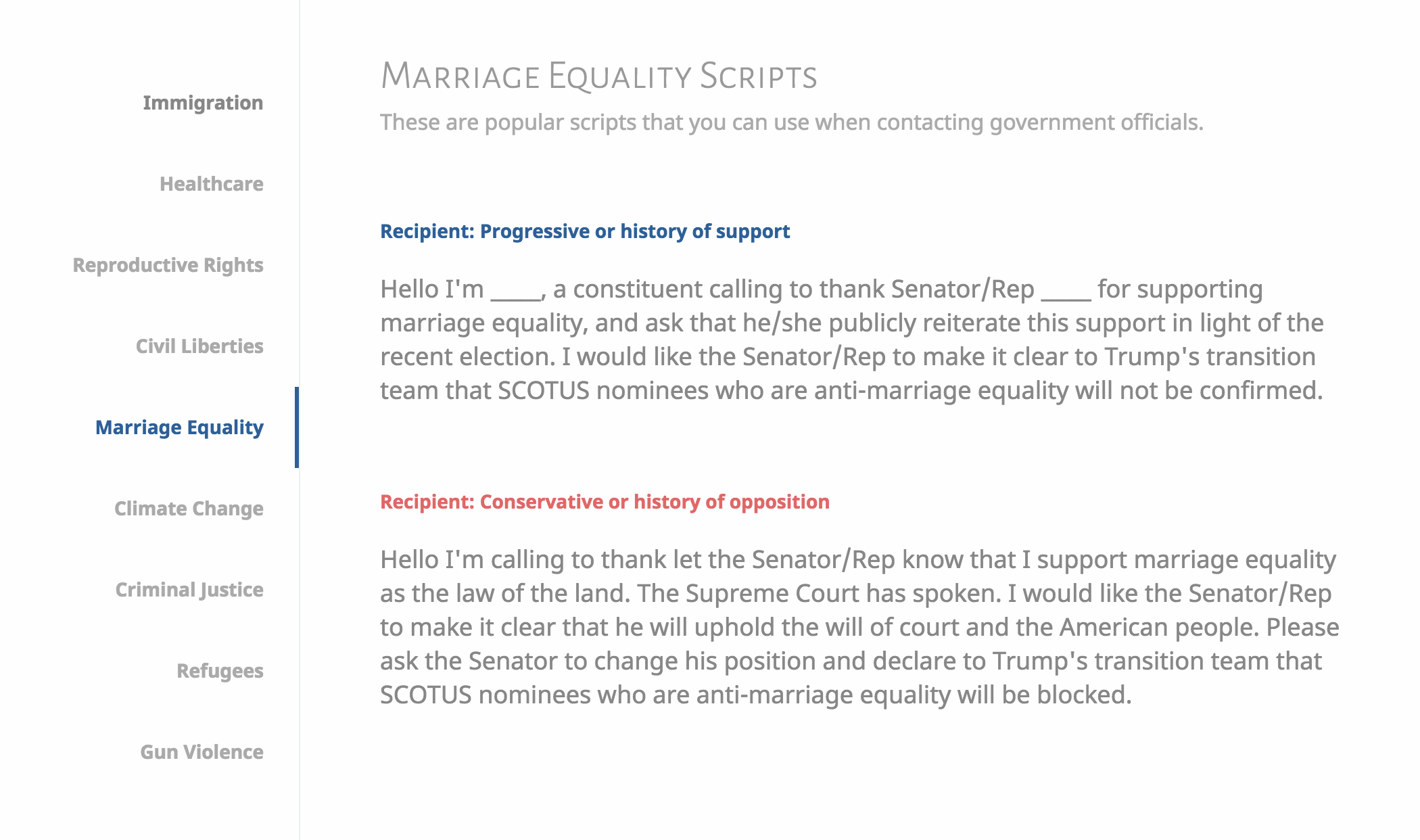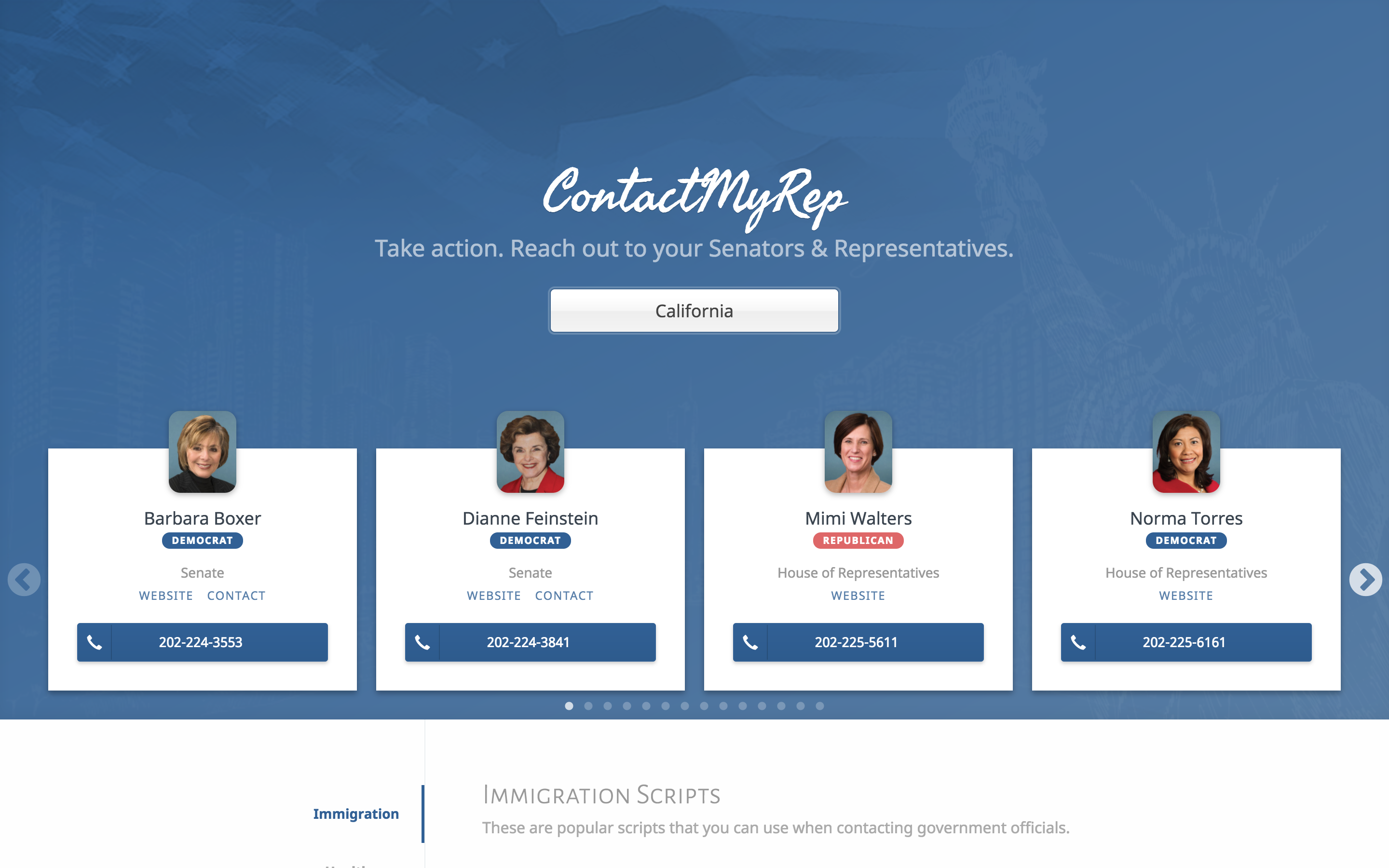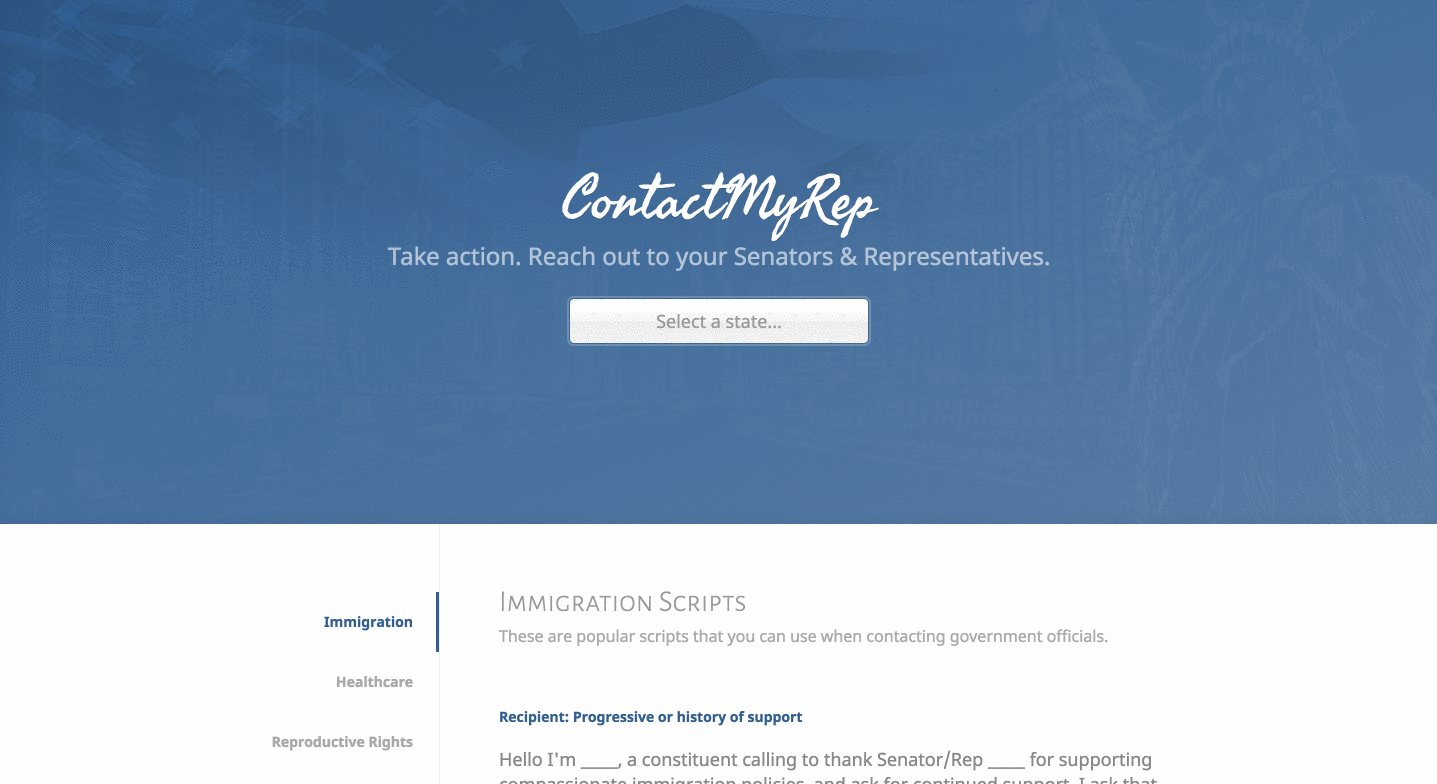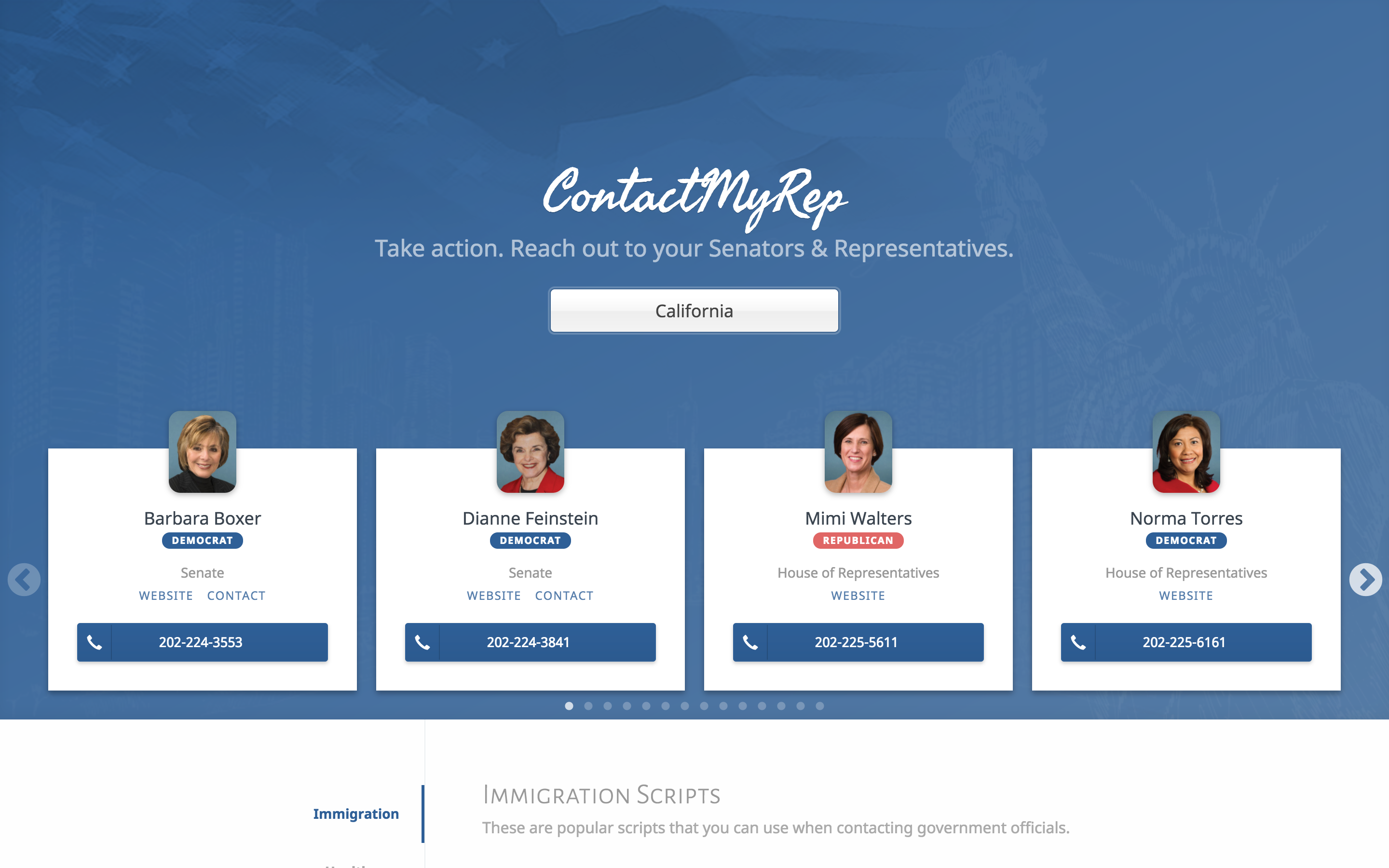 Over the last couple days I put together this simple website that helps people easily find the contact info for their senators & representatives in Congress, click-to-call, and use Kara Waite's phone scripts. I know some other people have been hacking on similar ideas, and I love it. I'm stoked other people are trying to build solutions as we… See more