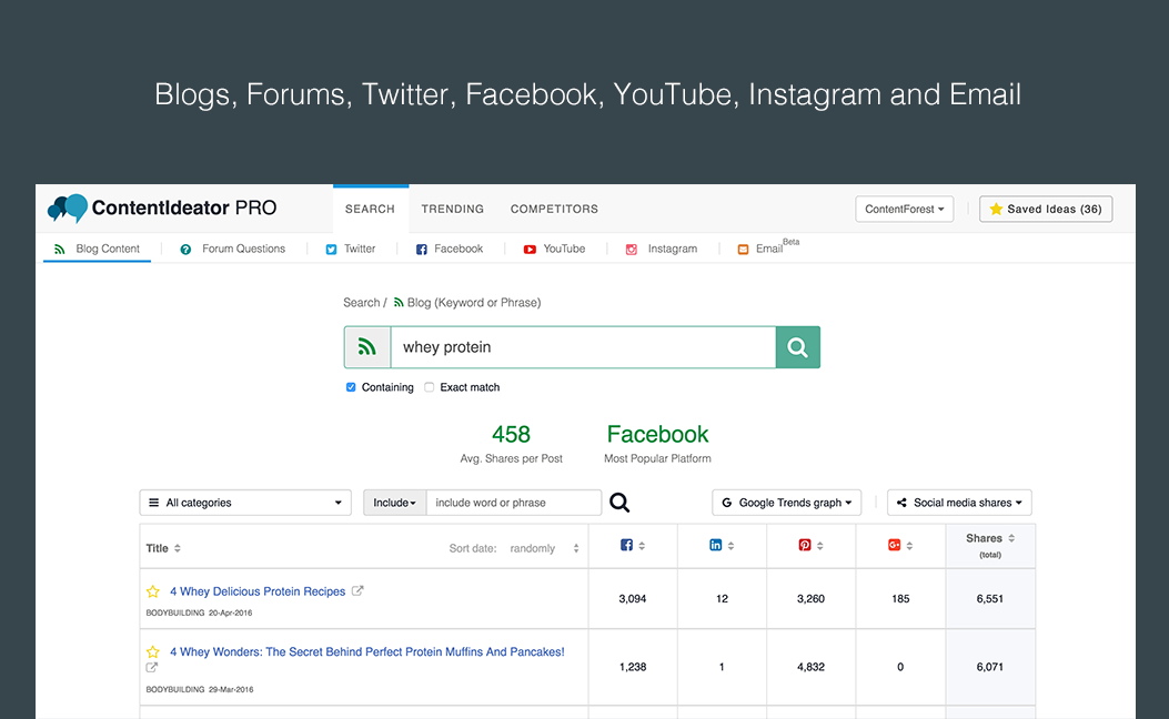 ContentIdeator is a tool for content research/insights, which covers all major content channels (like Blogs, Forums, Facebook, Twitter, Instagram, YouTube and Email with more to come like Pinterest, LinkedIn Pulse and Medium etc.).