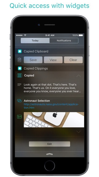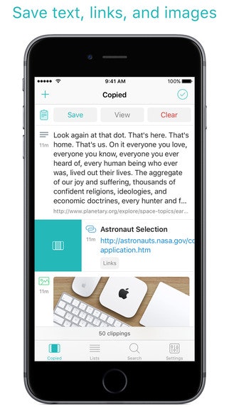 This is a great little app. It has a Mac version that syncs instantaneously with the iOS app. Copy on one device, paste in the other. Very nice. Also: has a flexible system to save your clips in folders/lists, notifications, a very handy share function and lots of other goodies.