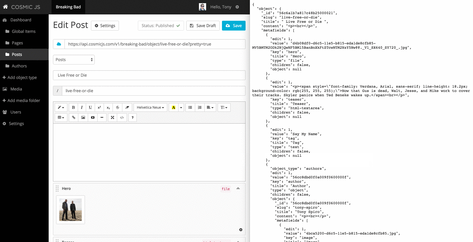 Also we have example applications that you can deploy in just a couple minutes and are fully editable within the CMS: https://cosmicjs.com/apps