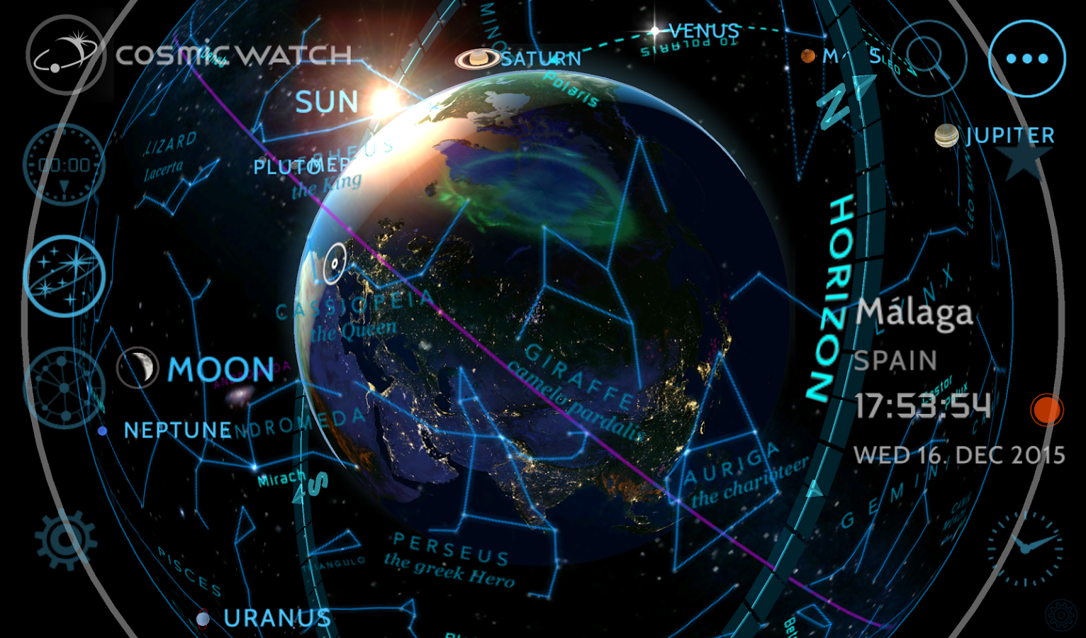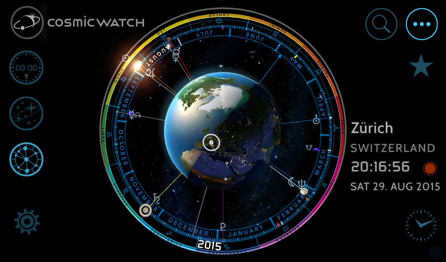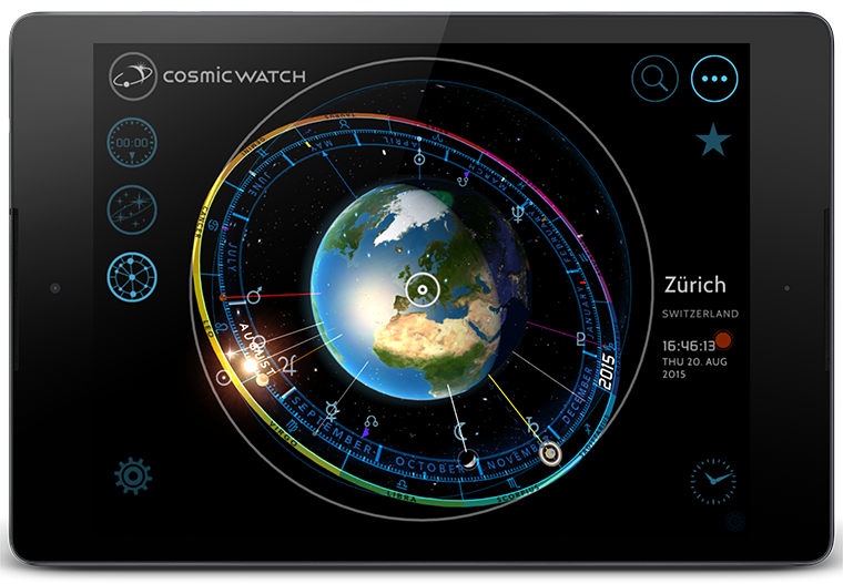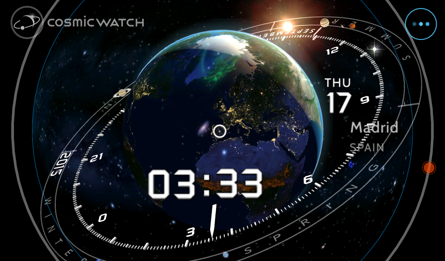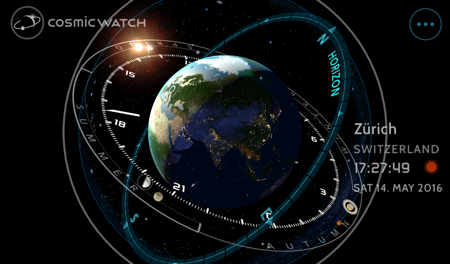 Cosmic-Watch shows you how to read time according to the motion of the cosmos. Watch the sky, the Earth cycles and the dynamics of the solar system in the past, present and future. Learn about astronomical events and bring the sky back to your everyday life.