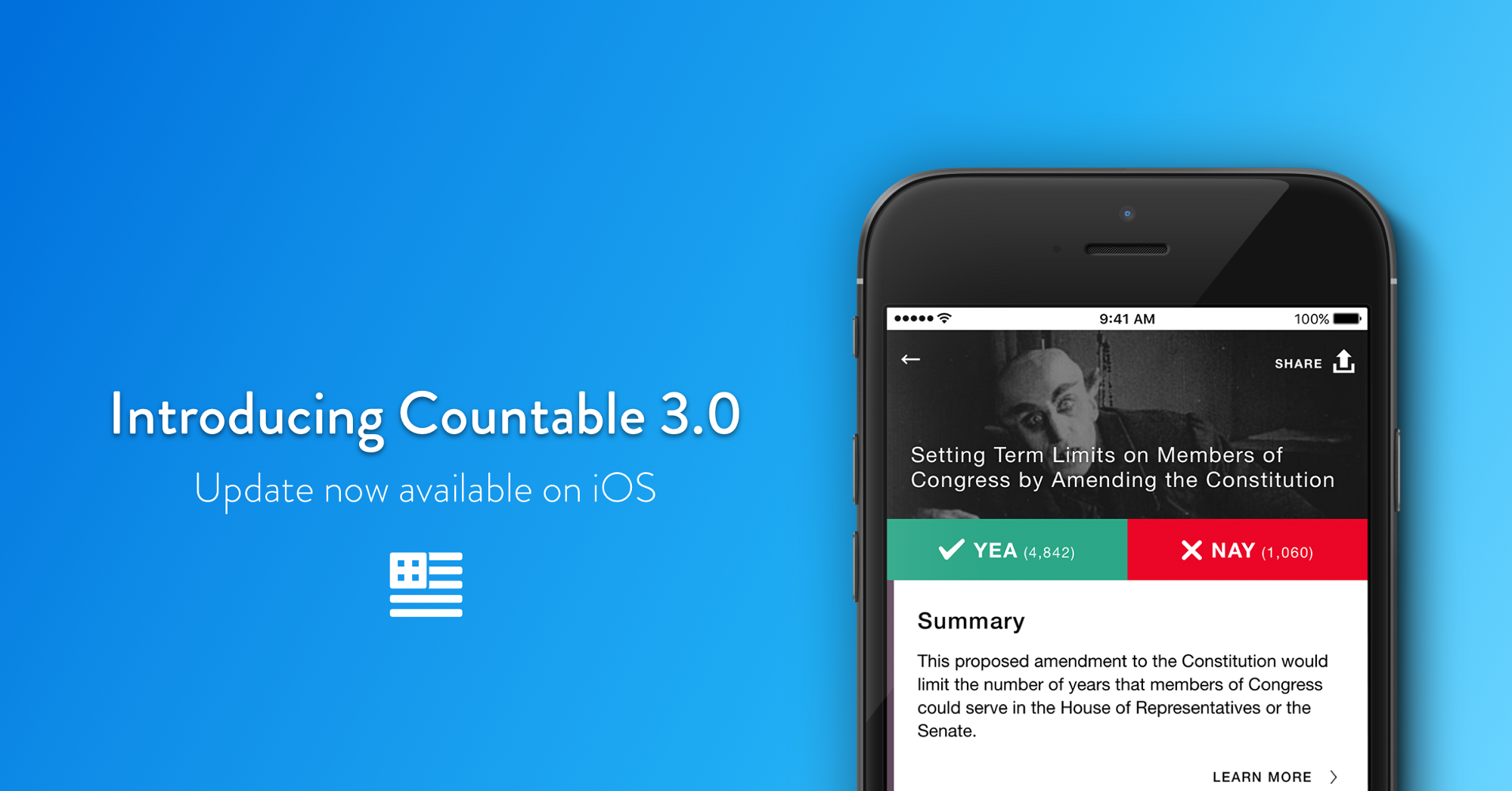 Hey all - the Countable team is thrilled to unleash a totally revamped version of our iOS app today. There are a ton of great updates, all of which focus on making it easy to understand bills in Congress and telling your lawmakers how they should vote. We'd love to hear what you think!