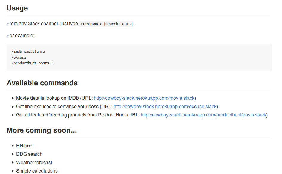 Maker here. I created cowboy out of curiosity to make power use of Slash commands of Slack. Cowboy is extensible and has a few powerful commands right now, which you can use right away in your Slack. Look up for a movie on IMDb, or get a list of featured posts on Product Hunt -- get everything without leaving your Slack. Isn't it sounds good, huh?